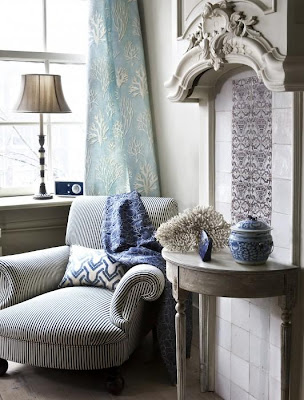 Luchtige, wapperende gordijnen zijn beeldbepalend bij deze woonsfeer: kies voor linnen gordijnen met borduursels of strepen. Luxe plaids van wol en zijde geven warmte bij de frisse zeebries ’s avonds. Kussens zorgen voor comfort en hebben opvallende koraalmotieven, vissenprints of grote streep patronen.