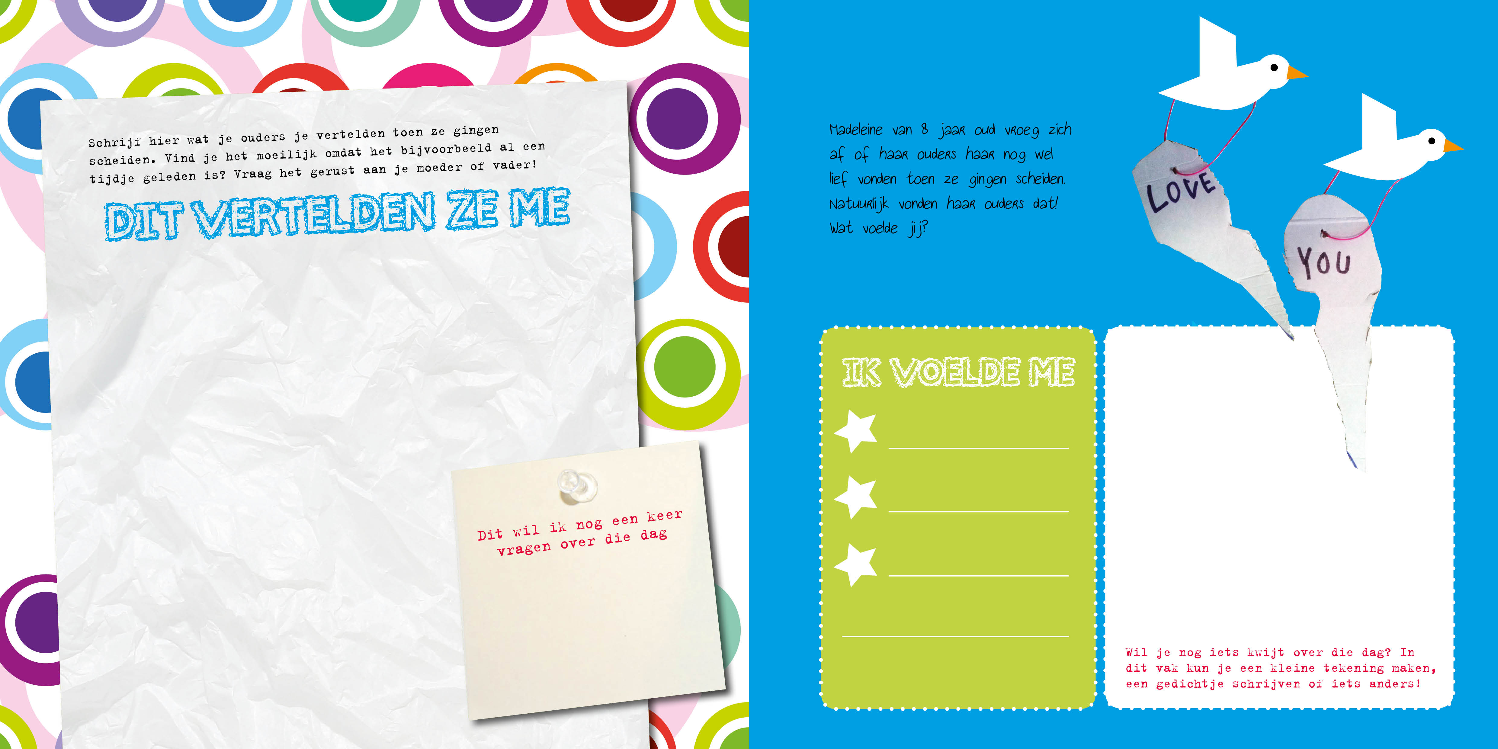 In het persoonlijke Herinnerboek kunnen kinderen hun versie van het verhaal opschrijven, gedachten kwijt en mooie herinneringen bewaren in de vorm van tekeningen, foto’s en collages. Omdat kinderen geneigd zijn in zichzelf te keren of sociaal wenselijke antwoorden te geven wanneer ouders uit elkaar gaan, kan dit boek het praten erover gemakkelijker maken.