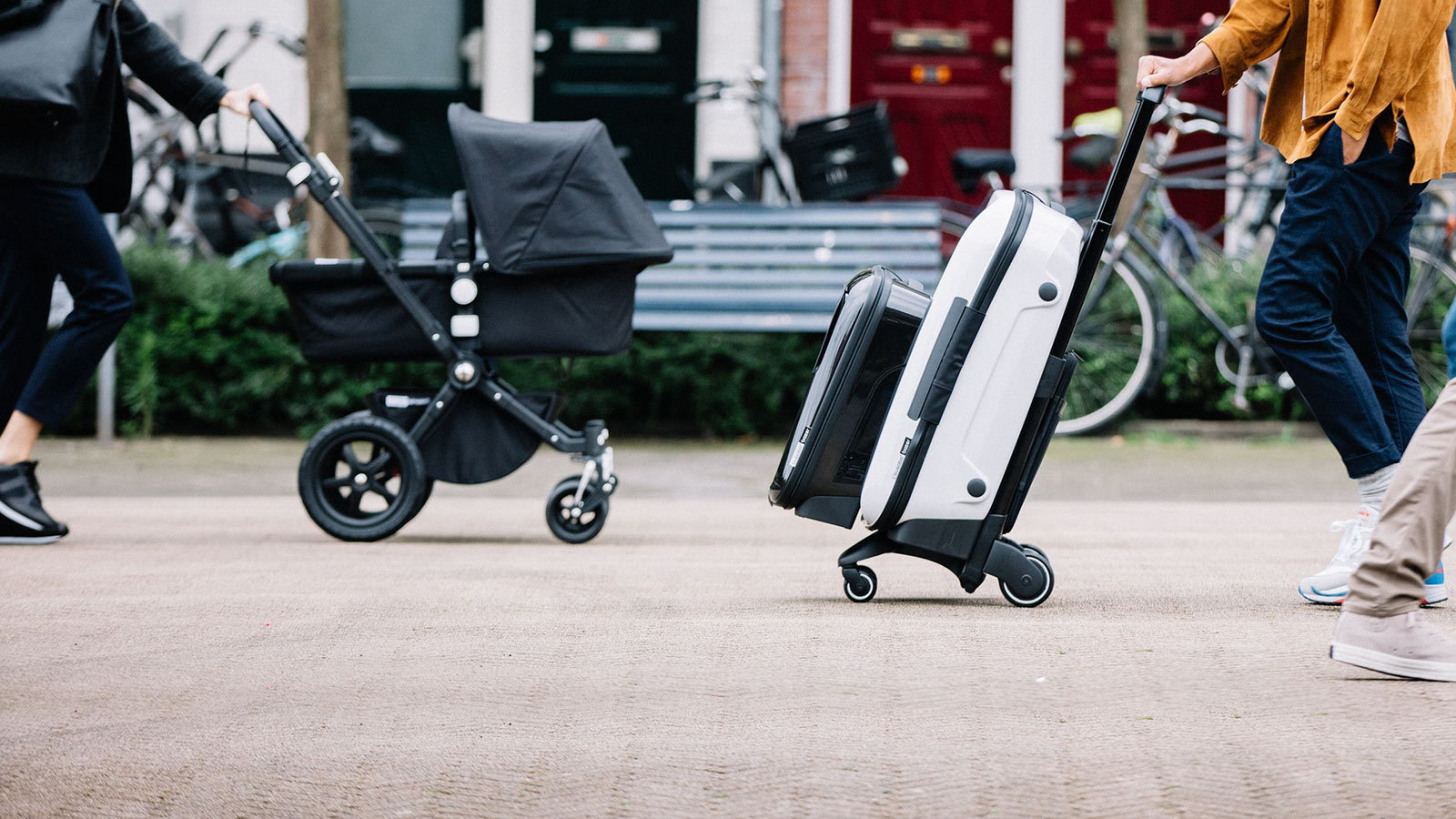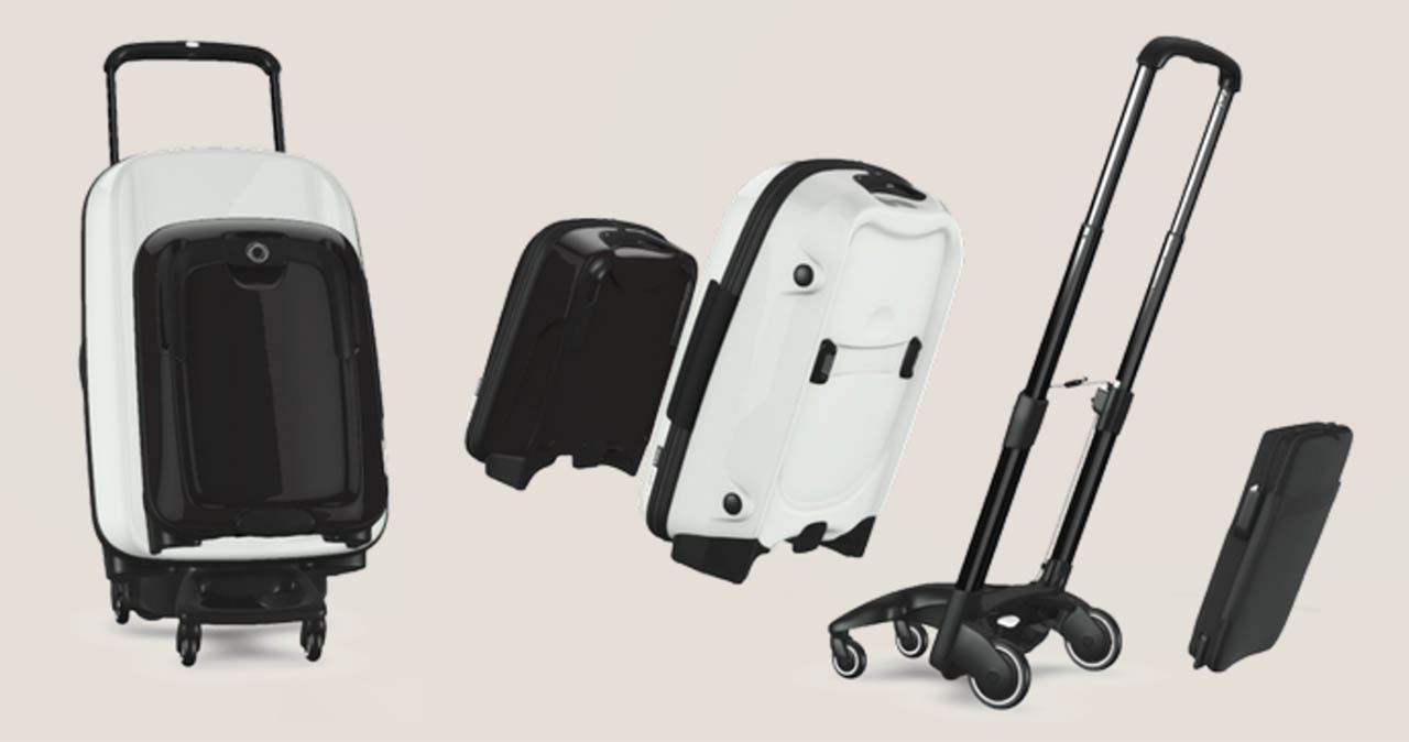 De basis van de Bugaboo Boxer is een uitklapbaar frame met vier wieltjes waarop er verschillende modellen koffers en tassen worden geschoven. En niet alleen kleine en grote koffers, maar ook een map voor de laptop en een leren tas. De Boxer kun je op twee wielen achter je aan trekken, zoals veel andere koffers, maar door een uitklapbaar tweede stel wieltjes kan je ook duwen. En je als je je koffers incheckt, klik je deze eraf, daarna klik je je (handbagage)tas op het frame.