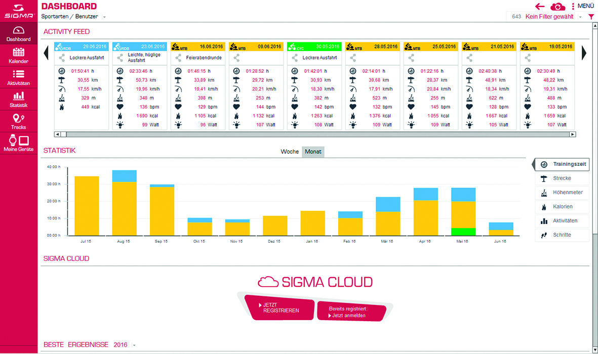 Op beide apparaten zijn 3 sportprofielen vooringesteld. Zo kan de training direct beginnen. Andere profielen kunnen via het DATA CENTER aan de eigen behoeften worden aangepast. Met de nieuwe ROX GPS modellen wordt het potentieel van de SIGMA plannings- en analysesoftware volledig benut. Voor de exacte track-navigatie wordt de via het DATA CENTER gemaakte route zoals gebruikelijk naar de ROX GPS overgedragen. Nieuw zijn de routepunten met persoonlijke tekst die individueel ingesteld kan worden en zich door een routepunt-alarm aankondigt. Een 3-assig kompas ondersteunt de GPS zodat de track altijd goed wordt getoond. De hoogtemeting vindt plaats via een geïntegreerde barometer, welke ook het stijgingspercentage aangeeft.