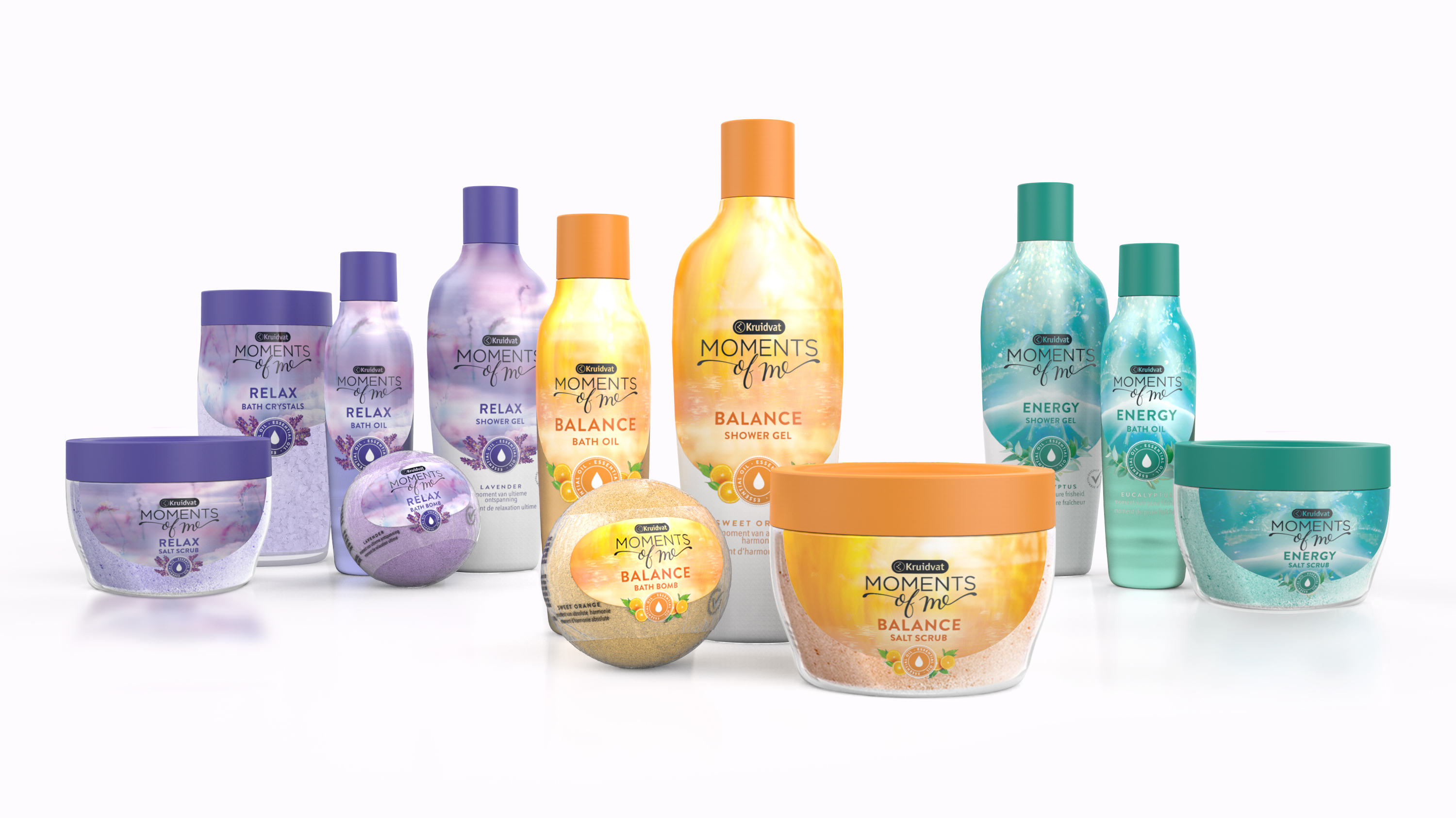 Ontsnap aan de dagelijkse sleur met luxe bad- en doucheproducten op basis van essentiële oliën. Heb jij balans,ontspanning of energie nodig? Elk geurthema zorgt ervoor dat jij in die mood komt. De douche- en badproducten van Moments of Me bestaan uit drie uitgesproken geuren; zoete sinaasappel, lavendel en eucalyptus. De lijn bestaat uit een heerlijke douchegel, scrubzout, aromatische badolie, badzout en verfrissende bruisballen. De huid wordt gevoed door alle heerlijk geurende, etherische oliën en ingrediënten.