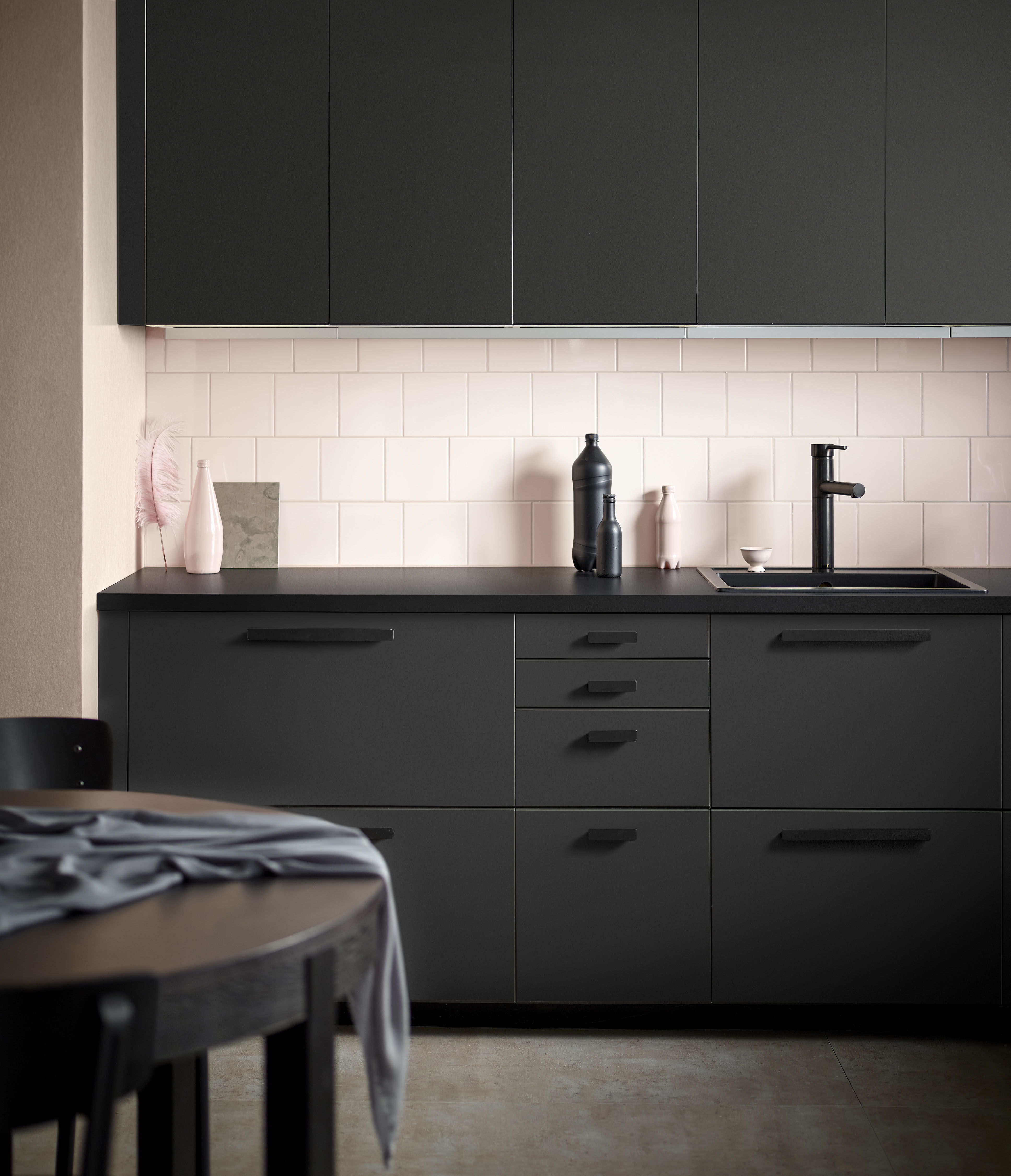 De keukendeuren van volledig hergebruikt hout zijn afgewerkt met een laag van gerecycled plastic. Het resultaat: kwaliteitsfronten in mat-antraciet design voor een vriendelijke prijs. Daarmee zijn deze keukenfronten een toonbeeld van Democratic Design. Alle producten van IKEA zijn ontworpen volgens dit principe, dat staat voor de juiste combinatie van vorm, kwaliteit, functie, duurzaamheid en een lage prijs.
