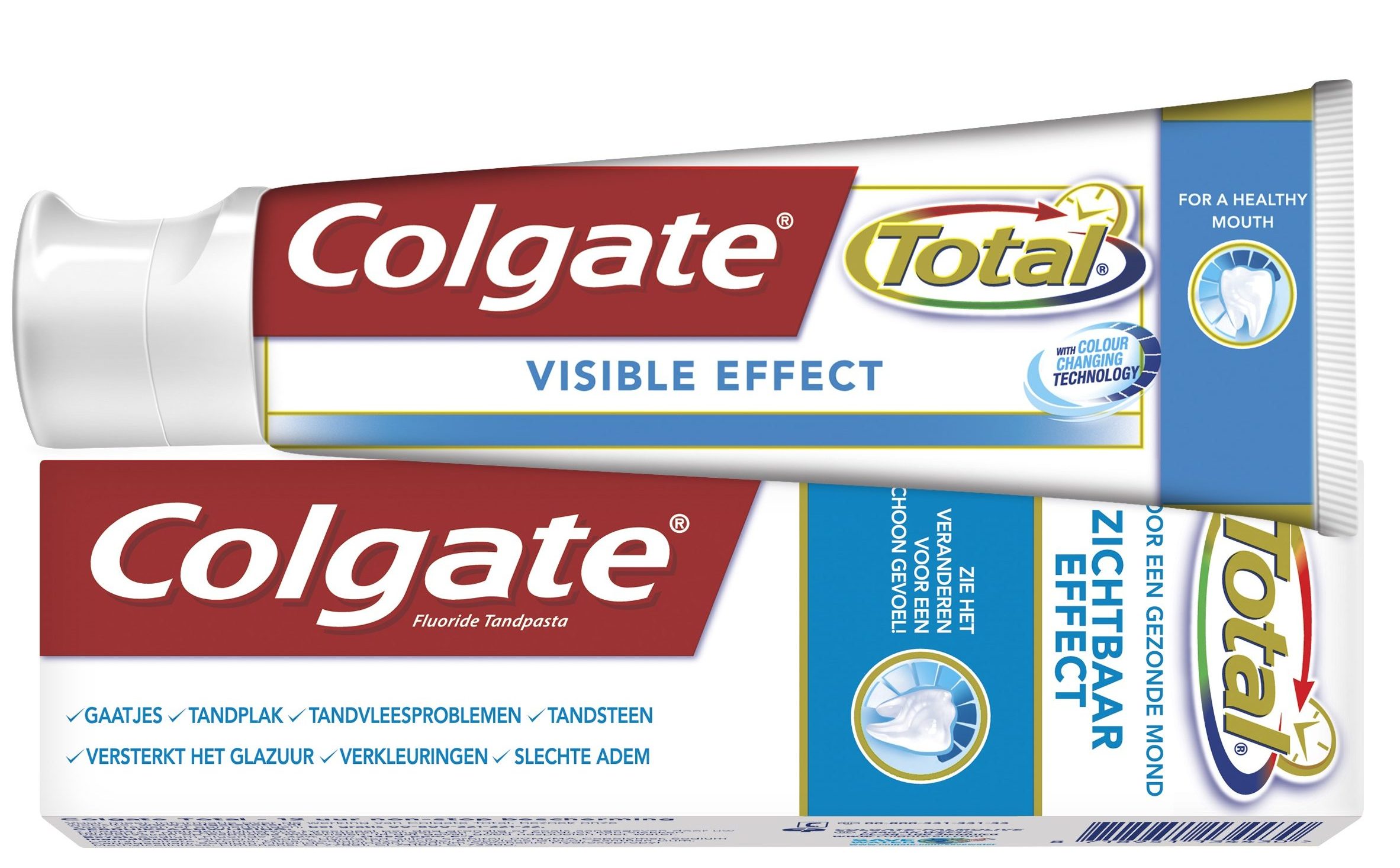 Colgate Total Zichtbaar Effect tandpasta heeft een geavanceerde formule die antibacterieel werkt en helpt om problemen zoals tandplak en tandvleesproblemen te voorkomen, 12 uur non-stop. Het pakt zelfs