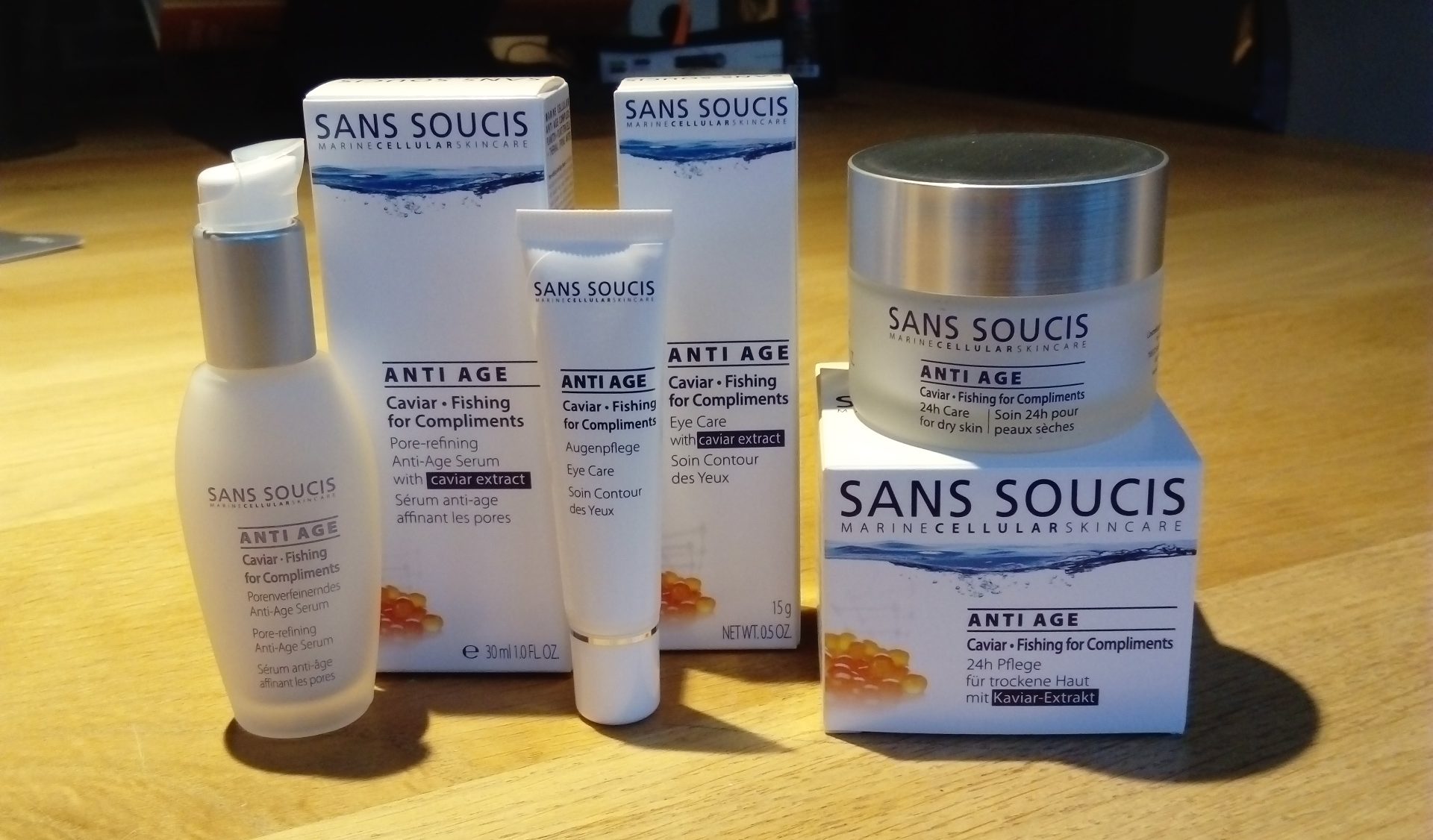 En deze maand heb ik nog 3 Sans Soucis producten ontvangen, die ik, als Aquaholic, heb mogen testen, nl. 3 producten uit de Sans Soucis Anti-Age Caviar Fishing for Compliments serie. En dat zijn het Caviar Pore Refining Serum, de Caviar 24 hr. dry skin er is ook een variant voor de normale/vette huid) en de Caviar Eye Care.