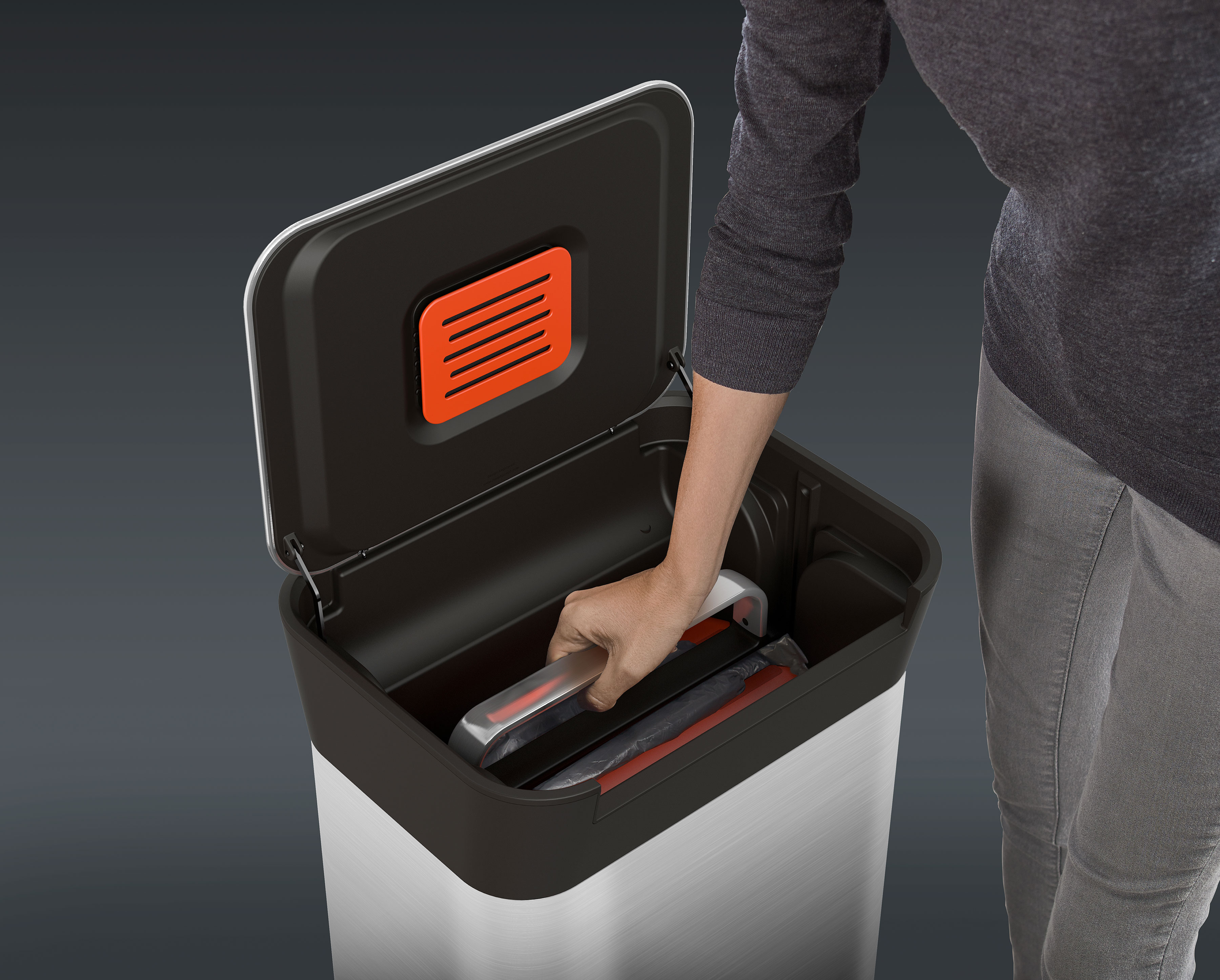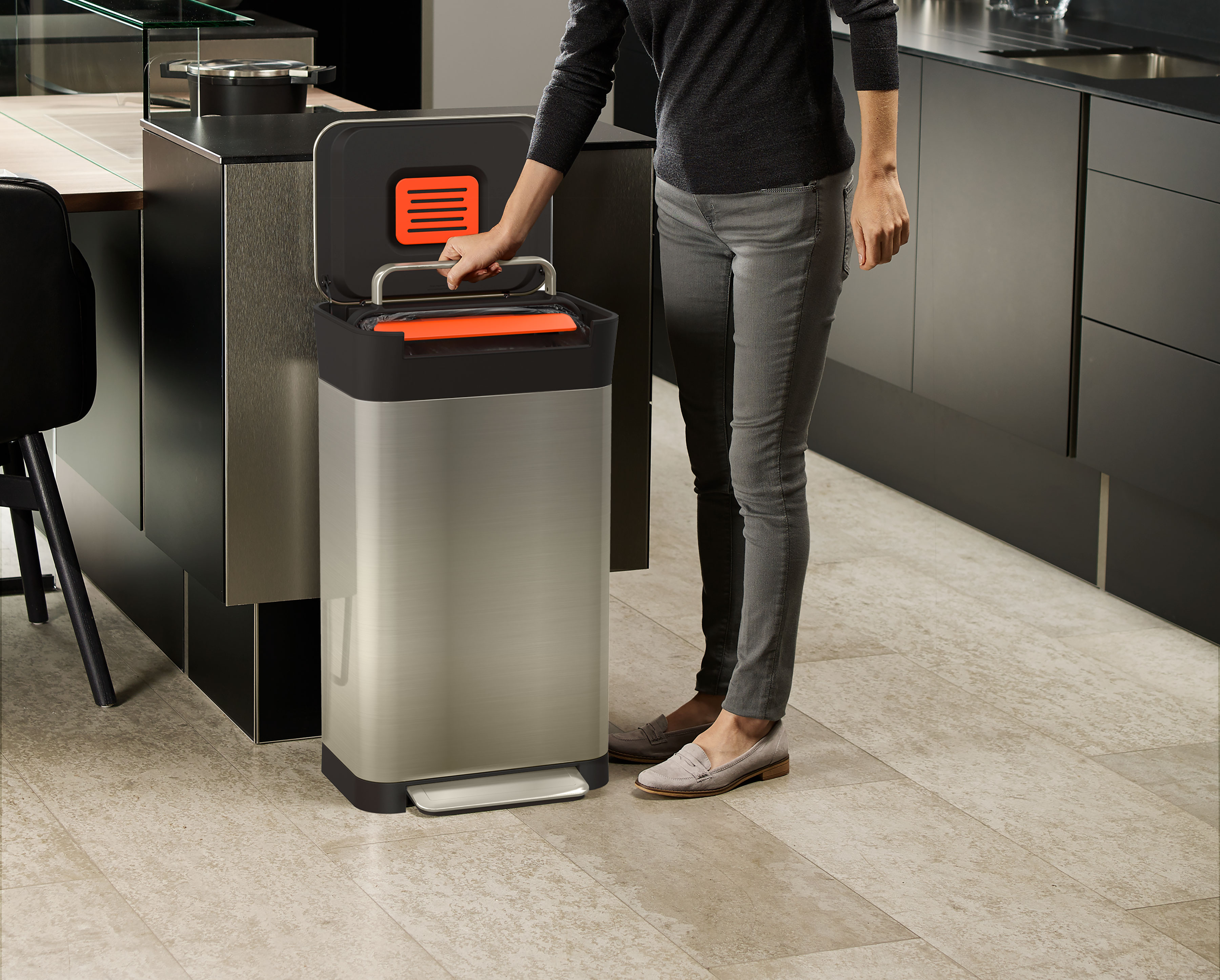 Na het grote succes van de ‘Totem Waste Seperation’ en het ‘Stack Recycling System’ voegen de gebroeders Joseph Joseph een nieuw en uniek afvalsysteem toe aan hun Intelligent Waste lijn; de Titan afvalbak. En in deze bak zit een ingebouwde compressor die het afval in de zak aandrukt. Hierdoor verzamel je 3 (!) keer meer afval dan in een normale afvalbak met hetzelfde formaat. En dat zonder dat de afvalzak scheurt want luchtkanalen voorkomen dat de vuilniszak zich vastzuigt na het aandrukken en het verwisselen van de afvalzakken gaat veel gemakkelijker door de handige functie die het deksel openhoudt. In het deksel is tevens een verwisselbaar geurfilter ingebouwd. Ook over het design is nagedacht, de stijlvolle afvalbak is gemaakt van (vingerafdrukvrij) RVS.