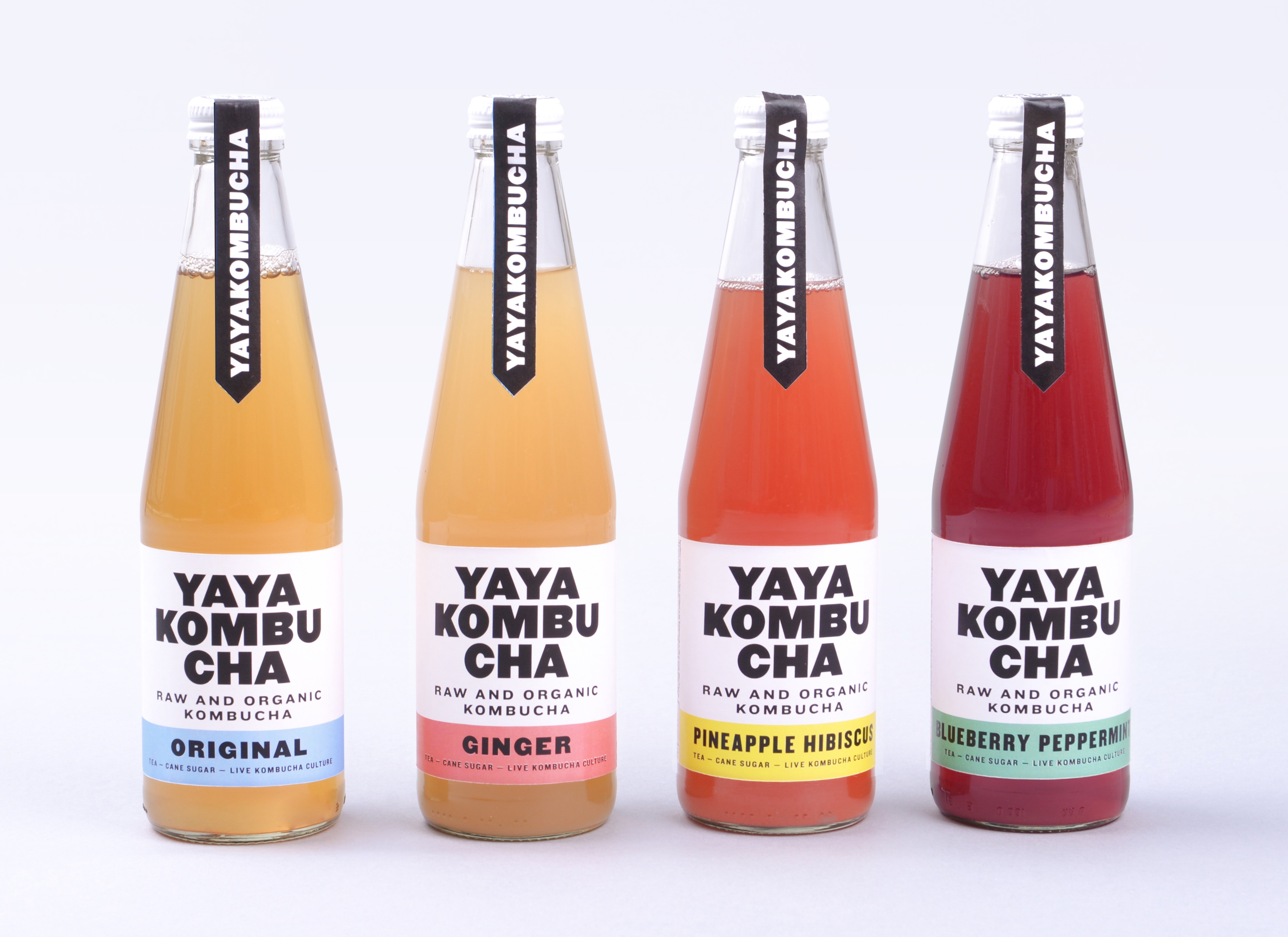 YAYA Kombucha is er in 4 smaken; Original, Ginger, Pineapple Hibiscus en Blueberry Peppermint.