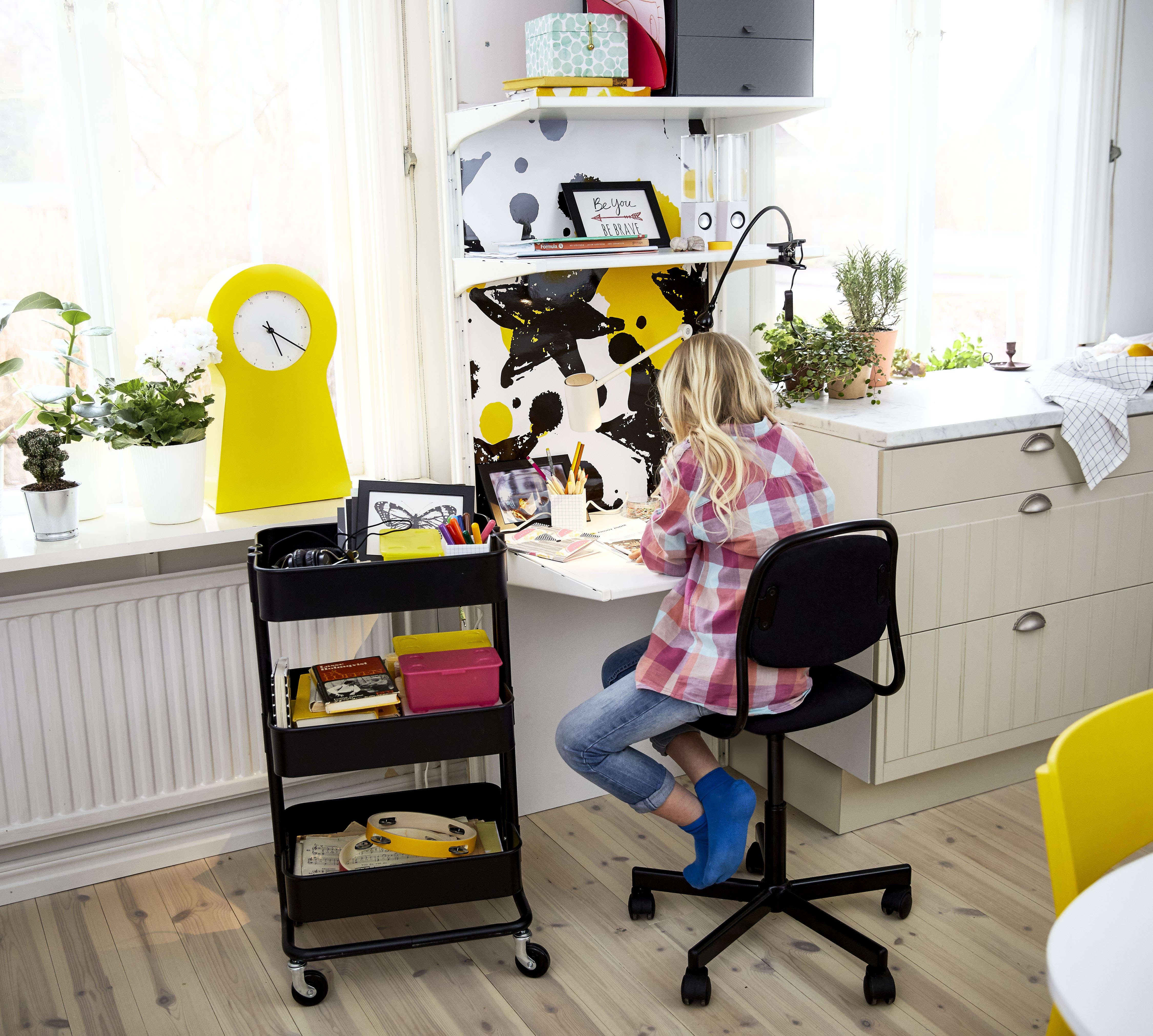Een eigen werkplek, maar toch midden in huis. Creëer een studiehoekje in de keuken of de woonkamer door een klein bureaublad aan de muur te bevestigen en zorg voor een goede stoel. De ÖRFJÄLL juniorstoel is niet alleen heel comfortabel, maar neemt ook nog eens weinig ruimte in. Pennen, USB-sticks en papieren krijgen een stijlvol plekje in de PALLRA miniladekast en de flexibele JANSJÖ klemlamp maakt het studiehoekje compleet.