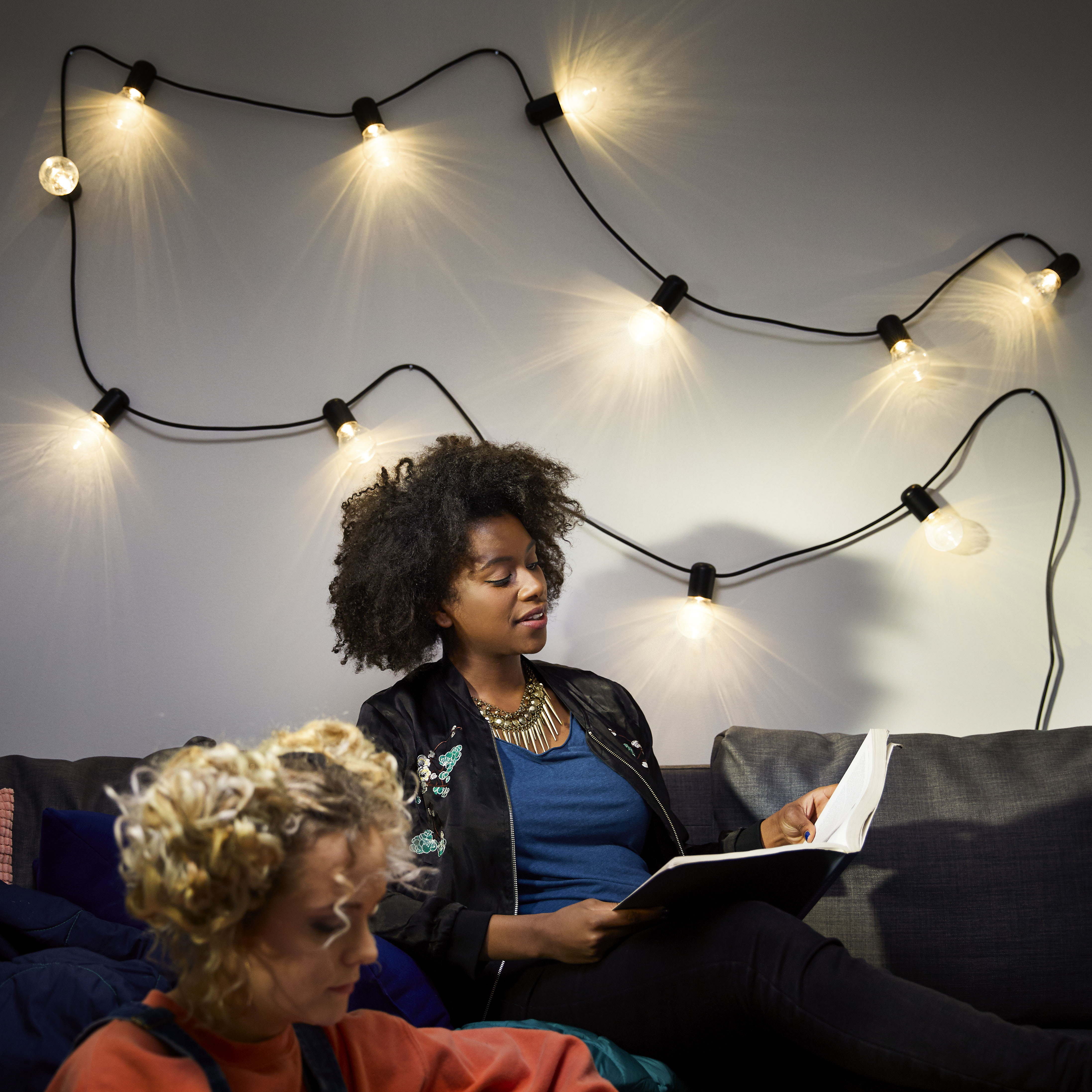 Samen studeren met vrienden? Creëer dan een ruimte die voldoet aan meerdere behoeftes. Combineer een goed verlicht bureau met een plek om te chillen. De DIHULT poef nodigt bijvoorbeeld uit om achterover te leunen. De stapelbare MARIUS krukken dienen als extra zitplaats en bijzettafel. Maak het tot slot gezellig met het sfeervolle SVARTRÅ led-lichtsnoer.