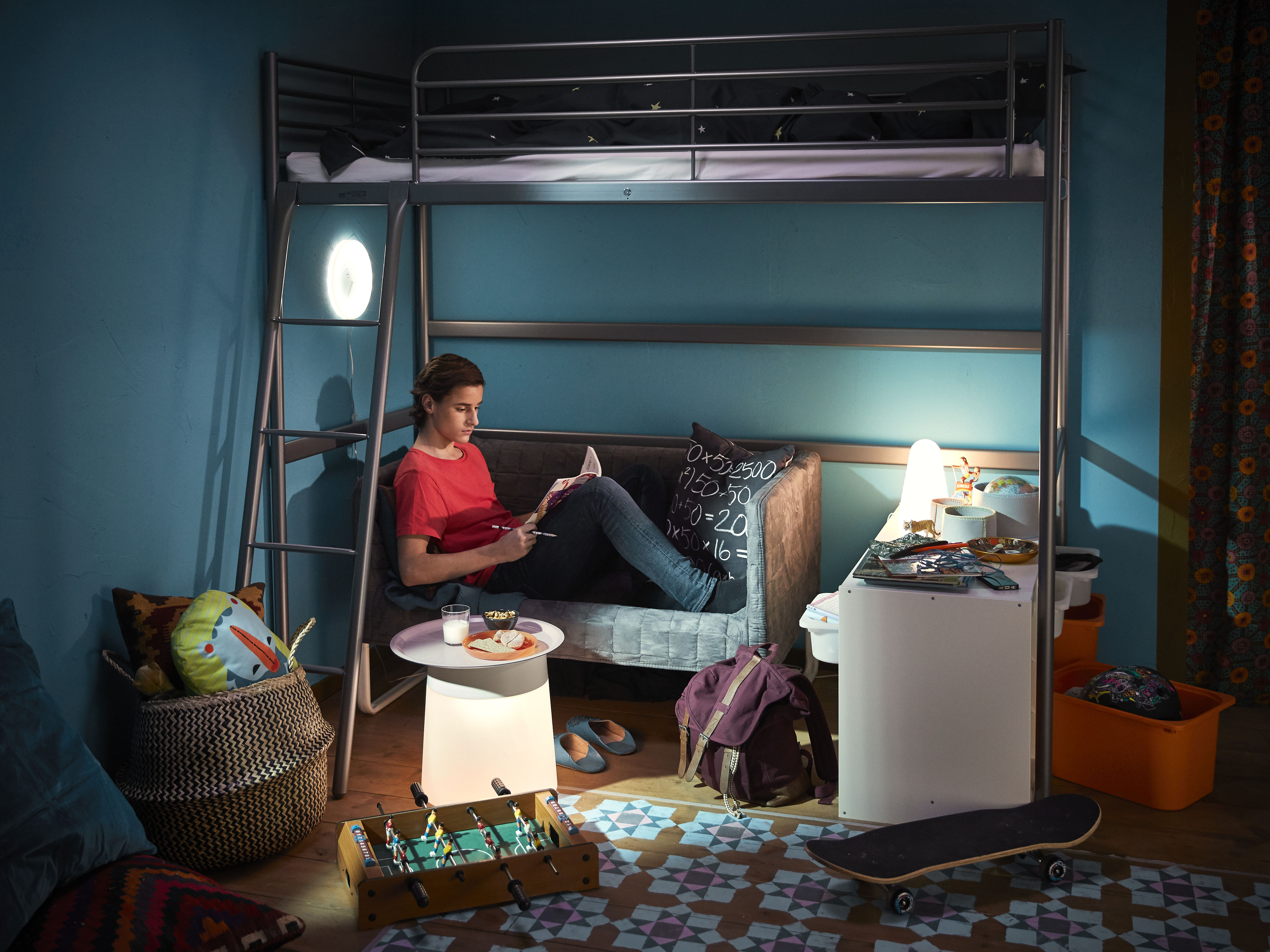 Er zijn kinderen die zich niet kunnen focussen in hun eigen kamer achter een bureau. Gelukkig is het heel eenvoudig om extra functionaliteiten toe te voegen aan elke ruimte in huis. Van de STUVA bank met bergruimte maak je bijvoorbeeld een comfortabele zitplaats met het HEMMAHOS kussen. De BYLLAN laptopondersteuning werkt ook perfect als schrijfoppervlak en dankzij de RISATORP trolley rollen pennen, boeken en andere studiespullen altijd met je kind mee.