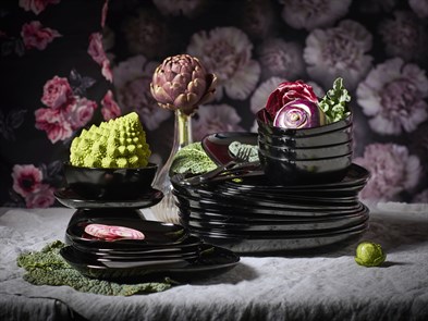 Sier je tafel met het glossy BACKIG servies. De borden en schalen zijn deels gemaakt van restjes glas uit IKEA fabrieken. De natuurlijke, ronde vormen reflecteren het licht voor een nog diepere, zwarte kleur.