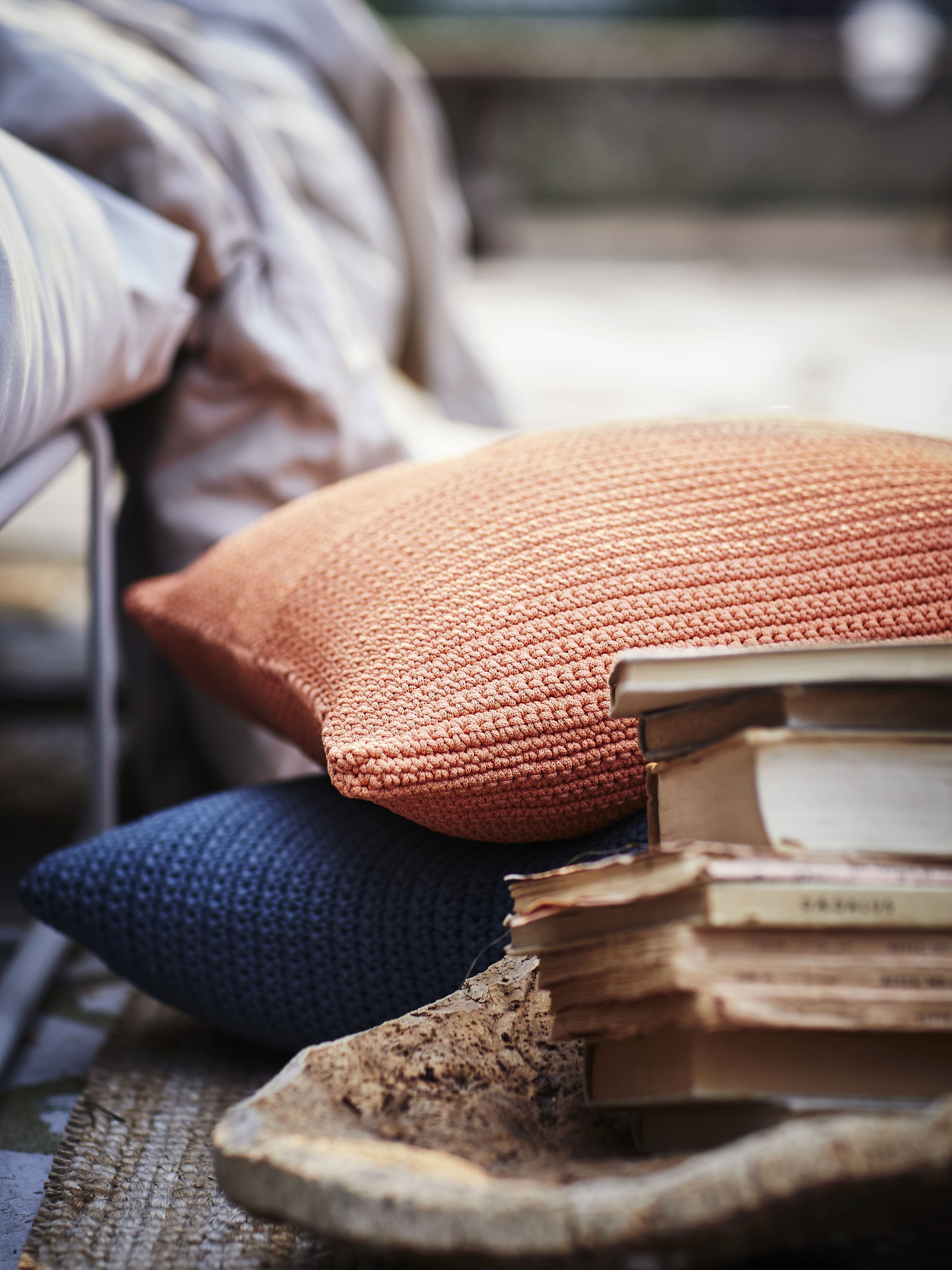 Ook in huis kan je het gezellig maken met items in vrolijke zomertinten, zoals de gestreepte SOMMAR 2018 dekbedovertrekset en het kleed in oranje en blauw. De handgemaakte SÖTHOLMEN kussenhoezen in warme kleuren, vormen stijlvolle accessoires voor binnen én buiten.