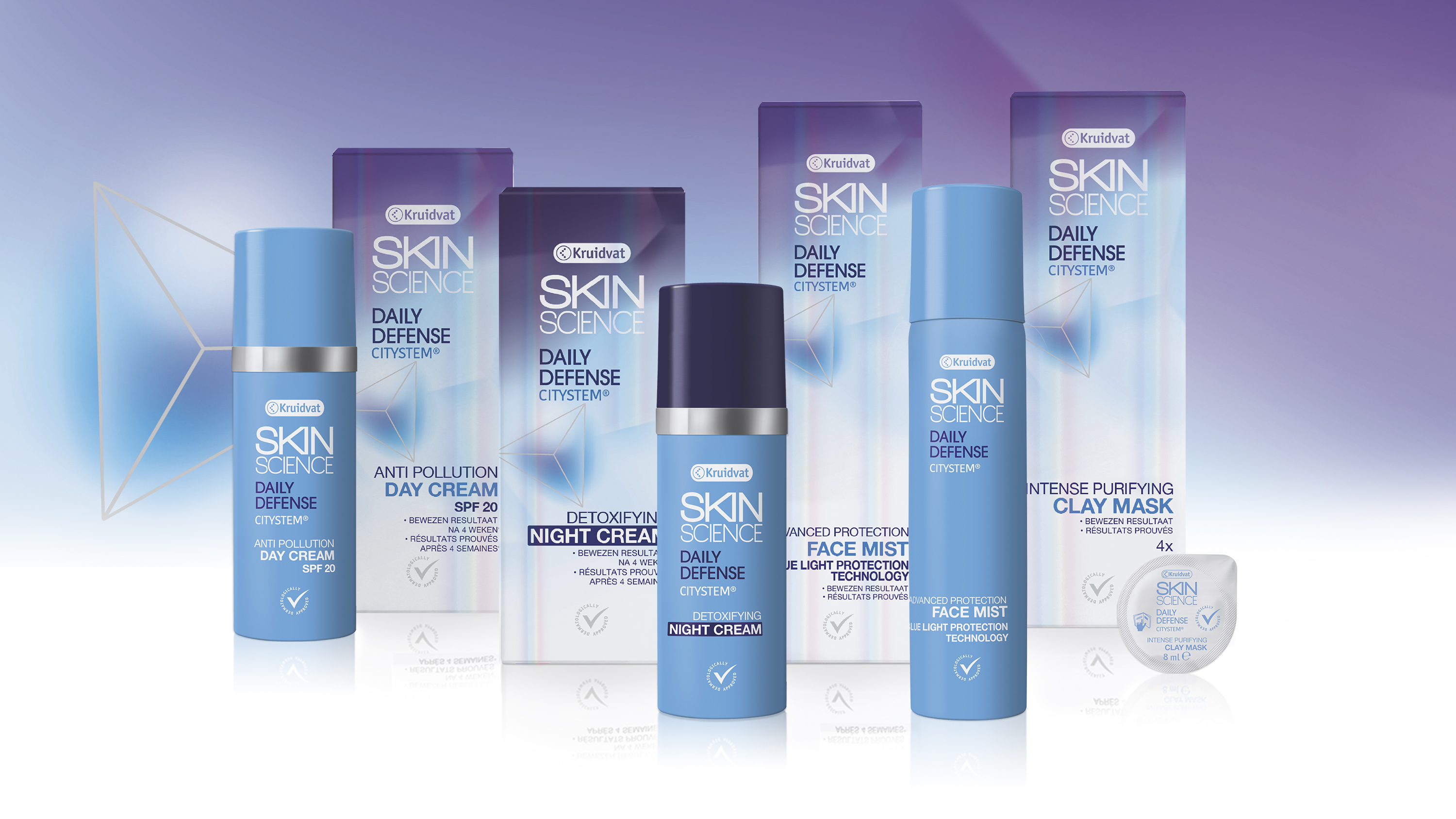 Met een geavanceerd complex aan hoogwaardige ingrediënten zorgen de Kruidvat Skin Science Daily Defense producten ervoor dat de huid wordt beschermd, ontgift en intens gehydrateerd. Zo is het ingrediënt Citystem speciaal ontwikkeld om de door milieuvervuiling veroorzaakte huidproblemen aan te pakken. Deze natuurlijke actieve stof werkt in op de vorming van schadelijke radicalen en bouwt een beschermend schild op. Het ondersteunt het verdedigingssysteem van de huid, bevordert de huid te regenereren en voorkomt vorming van nieuwe rimpels. Het Dynamic Radical Control Complex is een premium antioxidant met 24-uur actieve werking. Het biedt overdag bescherming tegen door de zon veroorzaakte oxidatieve stress, terwijl het ’s nachts behoedt tegen vrije radicalen en het eigen anti-oxidatieve systeem van de huid ondersteunt. Tevens helpt het bestaande rimpels te vervagen. Tot slot heeft de Blue Light Protection Technology de unieke eigenschap de huid te beschermen tegen ‘digitale veroudering’ door de invloeden van blauw licht van computers, smartphones en tablets. Het ingrediënt cacaozaadpeptide bevordert een betere weerstand tegen oxidatieve stress die veroorzaakt wordt door hoogenergetische blauw lichtstraling. Kruidvat heeft de producten ontwikkeld in samenwerking met wetenschappers en zijn onafhankelijk getest. De producten zijn dermatologisch goedgekeurd, waarmee de kans op allergische reacties en irritaties wordt beperkt.