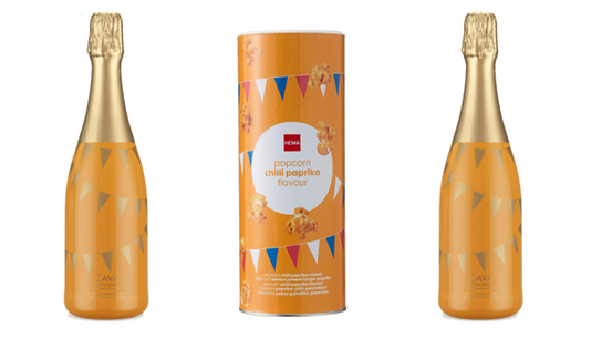 Ter ere van de verjaardag van onze Koning is HEMA’s welbekende cava in een oranje jasje gestoken. Daarnaast heeft HEMA limited edition kokers met oranjekleurige popcorn in licht pittige chilli en paprika smaak.