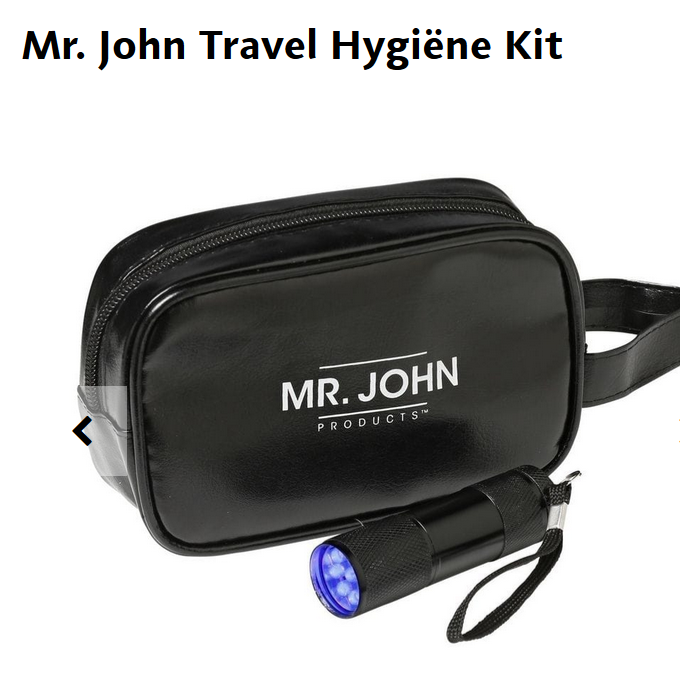 Hoe vies is jouw hotel, appartement of doucheruimte op de camping? Speciaal voor iedereen die ‘last’ heeft van smetvrees is er de Mr. John Travel Hygiëne Kit. Zo kan je onbezorgd genieten op je vakantie. De Mr. John Travel Hygiëne Kit bestaat uit een uv-lampje, hygiëne handschoenen, onzichtbare uv-spray, afstandsbedieningshoes (!), schoonmaakspray, stencil en vochtige hygiënedoekjes.