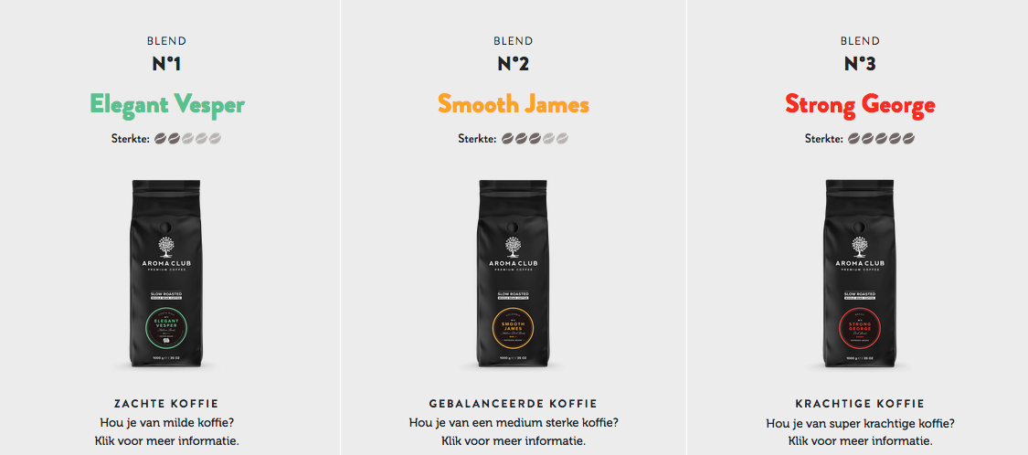 Wat gaan we testen? Drie smaken koffiebonen van Aroma Club: Elegant Vesper (No 1, sterkte twee boontjes uit vijf), Smooth James (No 2, drie boontjes uit vijf, qua sterkte) en Strong George (No 3, vijf boontjes uit vijf, sterk dus). Aroma Club richt zich op koffie op het werk en in de horeca, ofwel zakelijke markt.