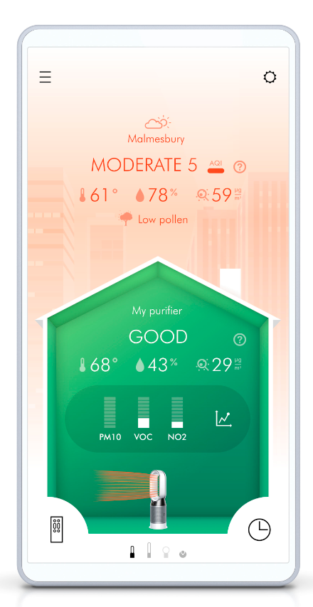 En via de Dyson app kan je ook de luchtvervuiling, temperatuur en luchtvochtigheid binnenshuis en buitenshuis live volgen.