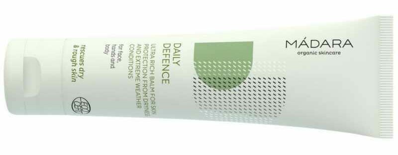 De Mádara Daily Defense Créme is een all-over-body crme die helpt om droogheid en ruwheid van de huid te verzachten en de huid beschermt tegen ruwe wind en kou. Ingrediënten zoals vitaminerijke bergframbozen en duindoorn olie verzacht, hydrateert en herstelt je huid. De créme helpt oa. om gesprongen en gebarsten lippen te genezen, je nagelriemen te verzachten en je kan deze créme ook gebruiken voor kleine kinderen. Kortom het is de ideale créme voor alle droge plekjes in je gezicht, op je handen en voeten en de rest van je lichaam.