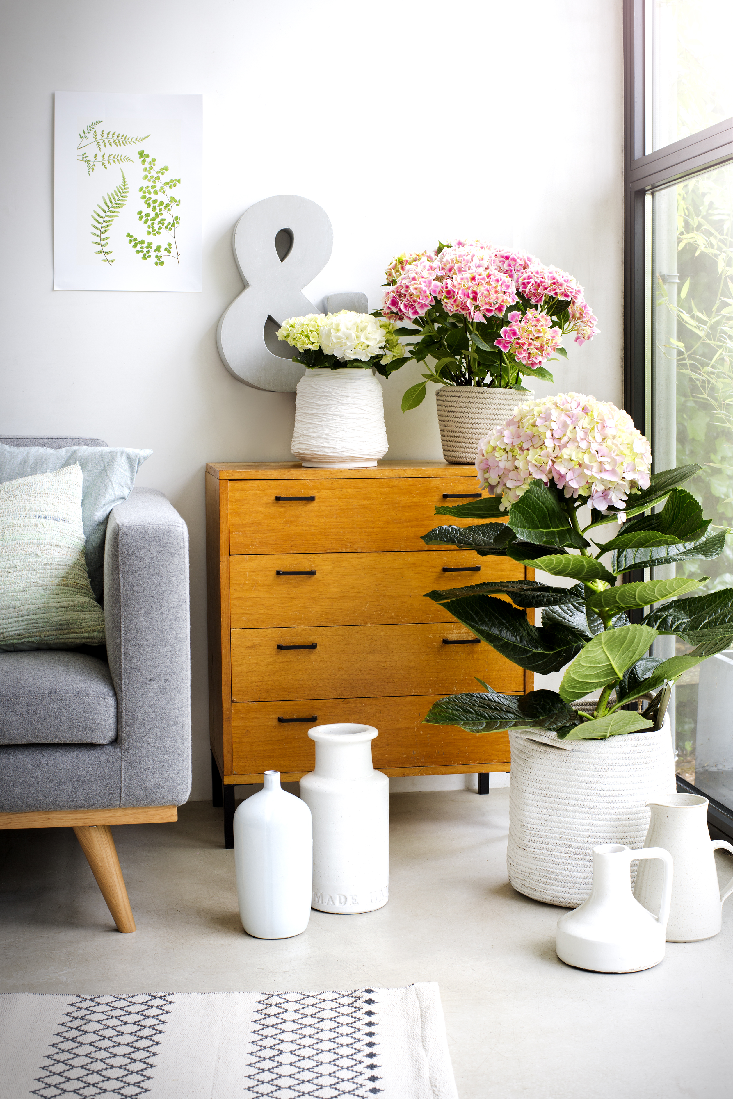 Hortensia’s zijn tegenwoordig in verrassend veel verschillende vormen verkrijgbaar. Er zijn bijvoorbeeld soorten met tweekleurige bloemen en met gekrulde bladeren. Het aantal en de grootte van de bloem varieert per soort. Van tientallen kleinere bloemen tot een solobloem van wel 30 centimeter groot. Met de potkeuze bepaal je de uitstraling van de kamerhortensia. De plant oogt stoer wanneer je ze in een robuuste bak van staal of beton zet, terwijl een rieten mand een meer landelijke sfeer geeft. Hou je van een urban jungle met kleurrijk accent? Zet dan hortensia’s en groene kamerplanten bij elkaar.