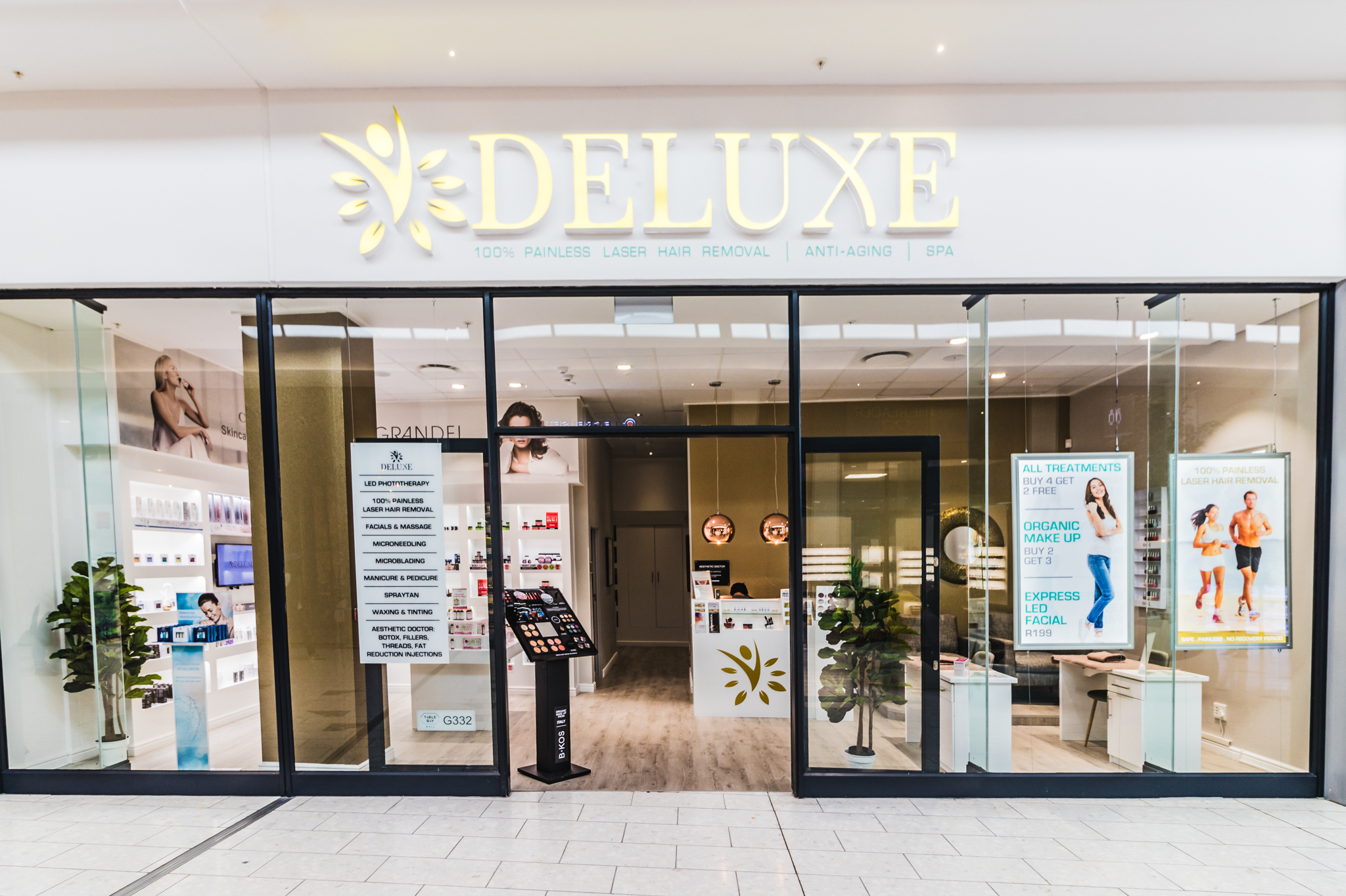 Deluxe Laser & Spa is een nieuw fris concept in de schoonheidsindustrie. De behandelingen van Deluxe Laser & Spa kenmerken zich doordat ze ‘s werelds meest geavanceerd zijn, voor een betaalbare prijs en door de FDA goedgekeurd. Deluxe Laser & Spa-behandelingen omvatten anti-aging (o.a. met radio frequentie en LED photo therapie), rimpelpreventie, huidverstrakking, body-contouring (cellulitis en vetreductie d.m.v. ultrasound) en 100% pijnloze permanente ontharing. Naast cosmetisch behandelingen biedt de Spa ook gezichtsbehandelingen en massages, waaronder facials, microneedling, peelings maar ook manicure behandelingen. Deluxe Laser & Spa verkoopt huidverzorgende producten van o.a. Dr. Grandel, Greenland, Ruhaku en Gold Collagen.