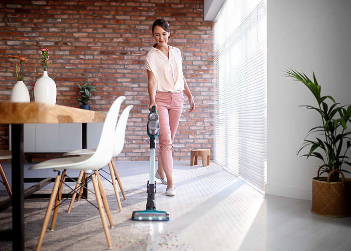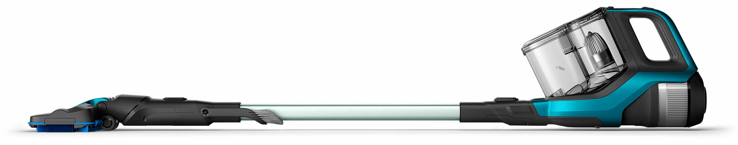 De Philips SpeedPro Max Aqua is flexibel en gemakkelijk te hanteren. De stofemmer zit aan de bovenkant, zodat je in een lagere hoek en zelfs helemaal plat op de vloer kunt schoonmaken en kan je zonder problemen onder laag meubilair stofzuigen en dweilen.