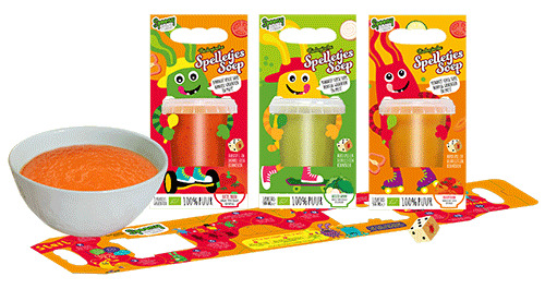 Het enige éxtra ingrediënt dat aan Spelletjes Soep wordt toegevoegd, is een bordspel met dobbelsteen aan de binnenkant van de verpakking. Het spelletje wisselt regelmatig, dus het blijft spannend. En omdat er seizoensgebonden gekookt wordt kunnen kinderen elke keer nieuwe smaken ontdekken.