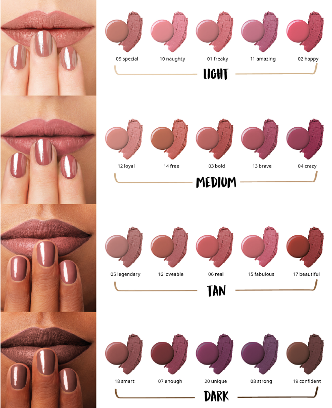 perfecte beautymatch, ongeacht de gelegenheid. En omdat de kleurnummers van de nagellak overeenkomen met die van de lipstick, herken je de kleurduo’s in een oogopslag.