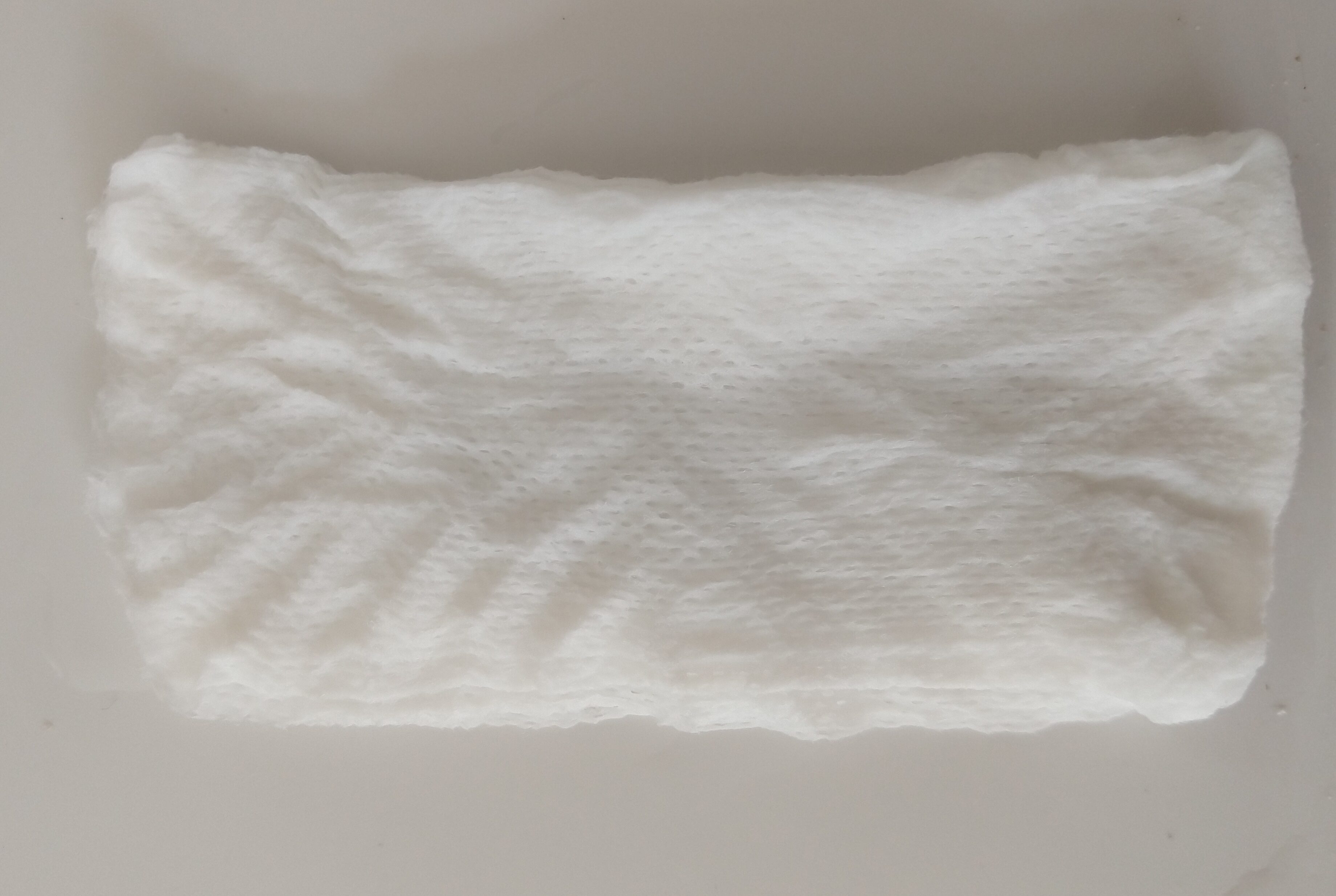 Daarna rol je hem uit en hou je een mooi opgevouwen doekje over en daarna is het nog een kwestie van het doekje openvouwen. En dan blijkt dat het best een groot formaat doekje is, in ieder geval groot genoeg om je gezicht heel goed te kunnen reinigen.