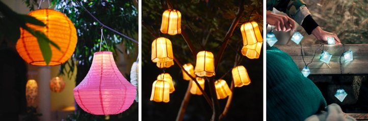 Geniet deze zomer van lange avonden buiten, in het licht van de SOLVINDEN lampionnen en lichtsnoeren met ingebouwde led lampjes. De lampionnen en lichtsnoeren zijn verkrijgbaar in verschillende kleuren en prints, vormen en formaten. Zo creëer je een romantische sfeer in de tuin of op het balkon. (Nu te koop)
