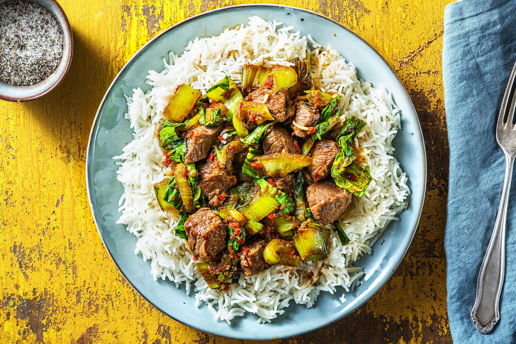 Verdeel op je bord de rijst of de noedels, doe daarop de biefstuk- of kipfiletreepjes met de groenten en giet er vervolgens de saus overheen.