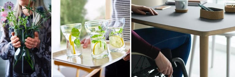 De drinkglazen en lichtgrijze vazen uit de OMTÄNKSAM collectie zijn dankzij hun bijzondere vorm extra makkelijk vast te houden en op te tillen. De tafels, bijzettafels en koffietafels zijn krasvast en gemakkelijk schoon te maken. Dankzij de open onderkant van de tafels is er extra veel ruimte, bijvoorbeeld voor een rolstoel.