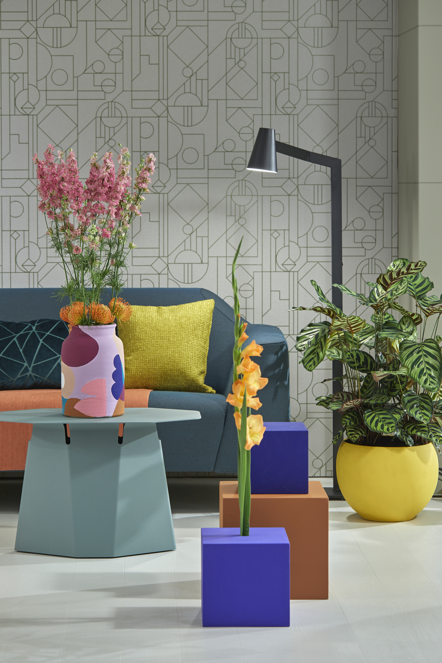 Binnen de stijltrend ‘Recentered Stage’ hebben geometrische vormen de overhand. Ze worden speels toegepast, alsof ze uit een blokkendoos afkomstig zijn. Door gebruik te maken van trappen, verhogingen en scheidingswanden krijgen ruimten een nieuwe dimensie. De kleuren zijn divers, van krachtige kleuren tot pasteltinten. Ze zorgen voor een kleurrijk, contrastrijk en speels geheel, maar worden door het gebruik van pasteltinten nooit schreeuwend. Materialen zijn in de trend ‘Recentered Stage’ van ondergeschikt belang; kleurgebruik heeft de overhand. De dessins zijn eveneens opgebouwd uit geometrische vormen. Soms overlappen deze grafische patronen elkaar waardoor er diepte ontstaat.