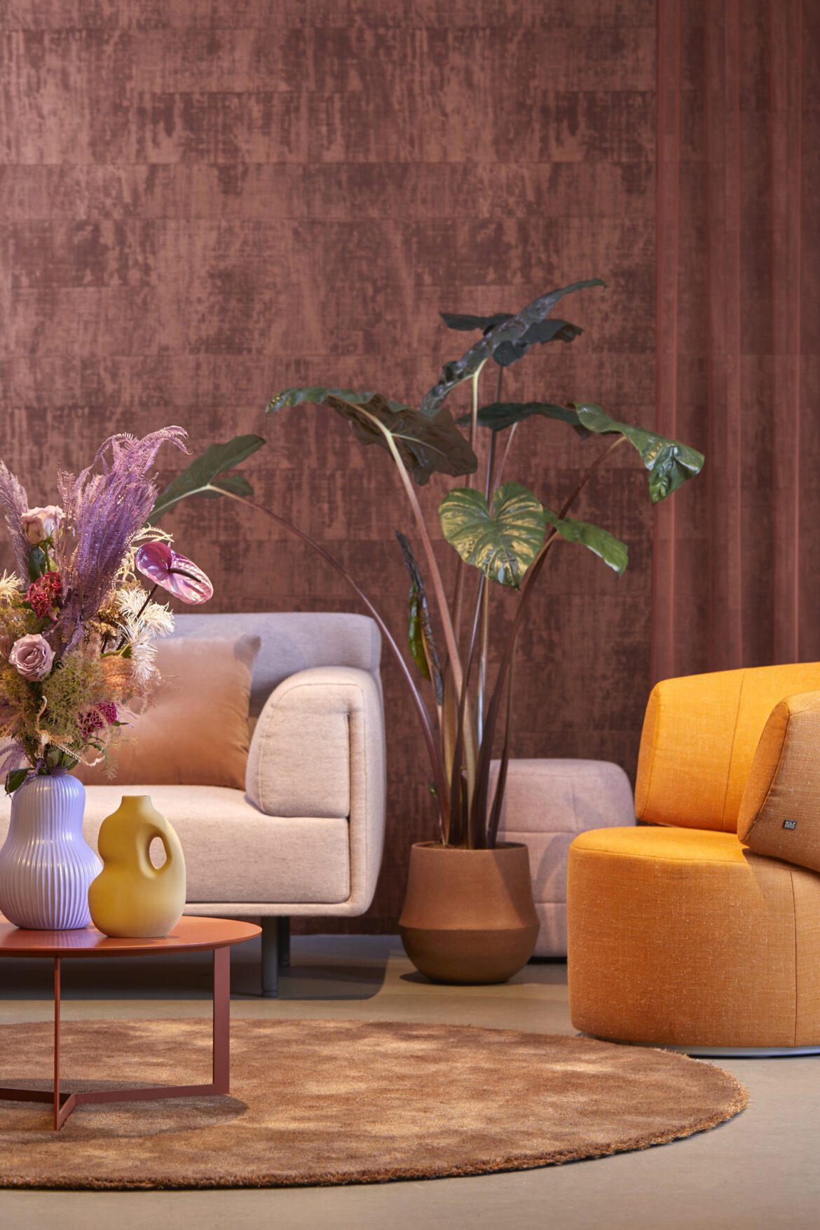De woontrend ‘Human Touch’ voelt vriendelijk en vertrouwd. Dat komt door een mix van afgeronde, bolle en organische vormen gecombineerd met een warm en vriendelijk ton-sur-ton kleuren van lichte en donkere huidtinten. Accentkleuren zijn lila en okergeel. Over het algemeen hebben meubels en accessoires hierbij een onregelmatige oppervlaktestructuur, meestal met een matte uitstraling. Ribbelstructuren duiken bijvoorbeeld veelvuldig op. Dessins zijn in de trend ‘Human Touch’ van ondergeschikt belang. Als ze worden toegepast, zijn deze vaak opgebouwd uit vage vlek- en veegpatronen of organische structuren.