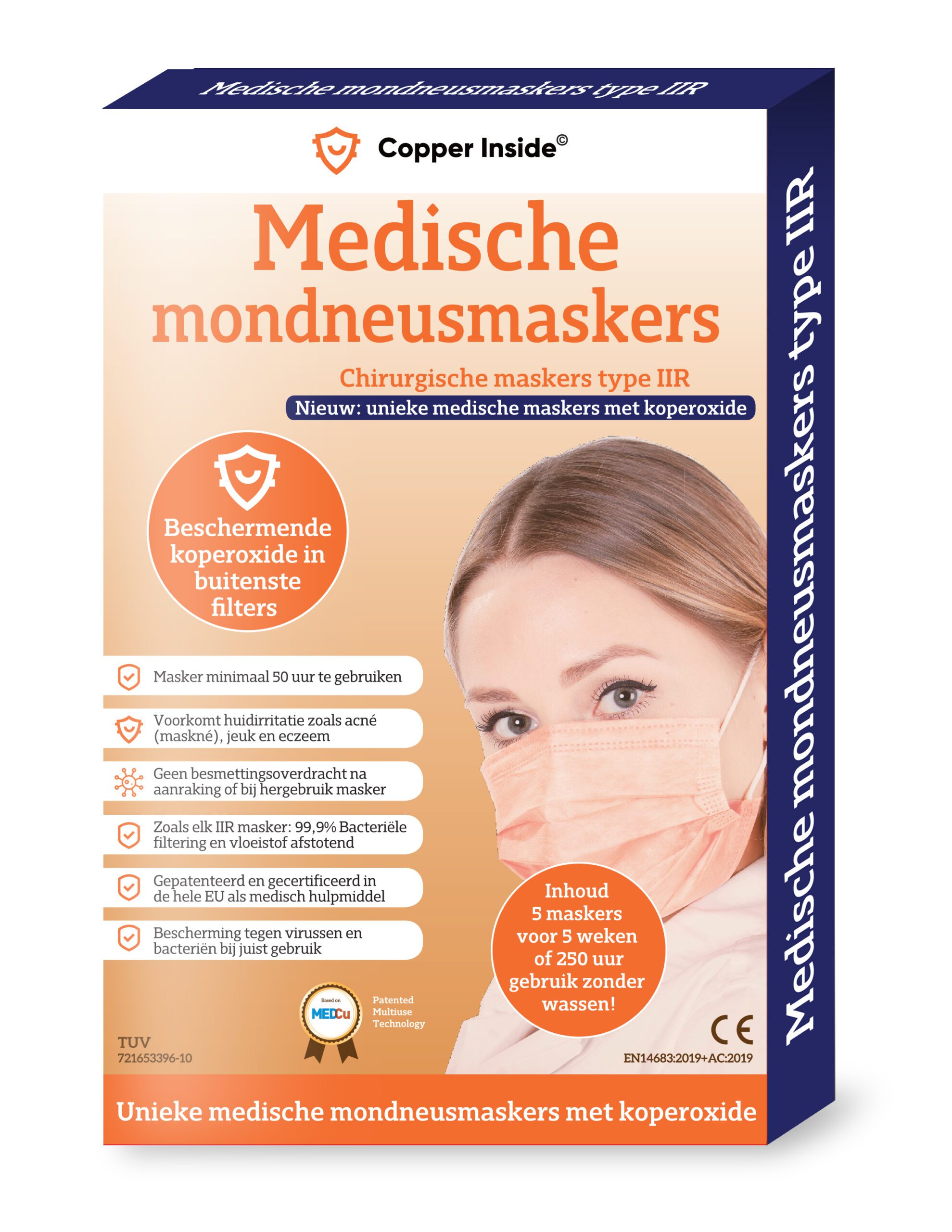 Maar er is nu een mondneusmasker dat een week lang veilig hergebruikt kan worden. Waarbij steriliseren niet nodig is en dat zowel jou als je omgeving beschermt tegen COVID-19. Het kan met koper. Het Copper Inside mondneusmasker is een EU-gecertificeerd en gepatenteerd product met koperoxide dat virusdeeltjes in minder dan een minuut elimineert en dat blijft doen. Het masker kan daardoor tot wel vijftig uur herhaaldelijk worden gedragen, zonder tussentijds te wassen. De zalmroze kleur ontstaat door de kleine hoeveelheid koperdeeltjes die in het mondkapje zijn verwerkt. Het masker is verder identiek aan de gangbare chirurgische maskers (IIR/EN14683). De virusdodende eigenschappen verminderen niet, het masker is aan vervanging toe als het is beschadigd of niet meer volledig aansluit op het gezicht.