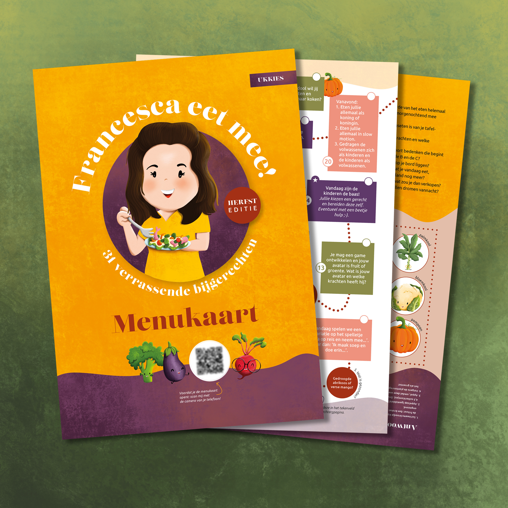 Maar er meer want Francesca kookt lanceert ook ‘FRANCESCA EET MEE’ MENUKAARTEN. De menukaarten zijn verpakt als een interactief spel, voor tijdens het avondeten. De menukaarten zijn er in twee versies: een voor de UKKIES (tot ± 10 jaar) en een voor GEZINNEN met (jong)volwassenen. Geheel volgens de visie van haar kookboek – 365 Dagen Koken – spelen de menukaarten in op het seizoen. De kleurrijke en inspirerende menukaarten staan boordevol leuke tafelspelletjes, grappige challenges, interessante filmpjes over producten, nieuwe gespreksonderwerpen, eetweetjes, een heerlijke muziek playlist, verbeeldingsvragen én de seizoensgroentebingo. Dit zijn alle bijgerechten voor een verrassende avond aan tafel.