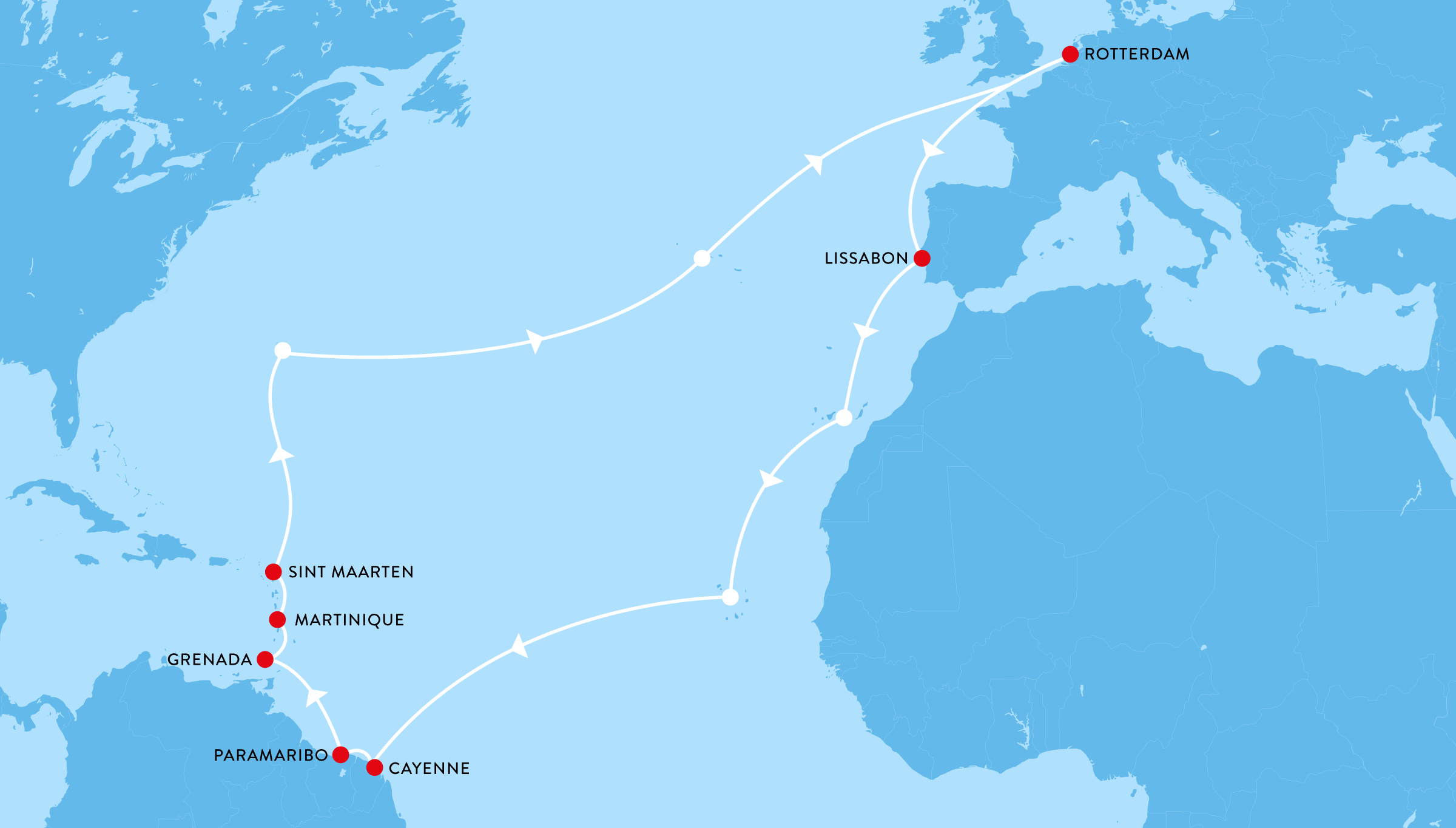 (Sint-Maarten – Rotterdam). Echte avonturiers kunnen de Grand Tour van ruim vier maanden boeken.