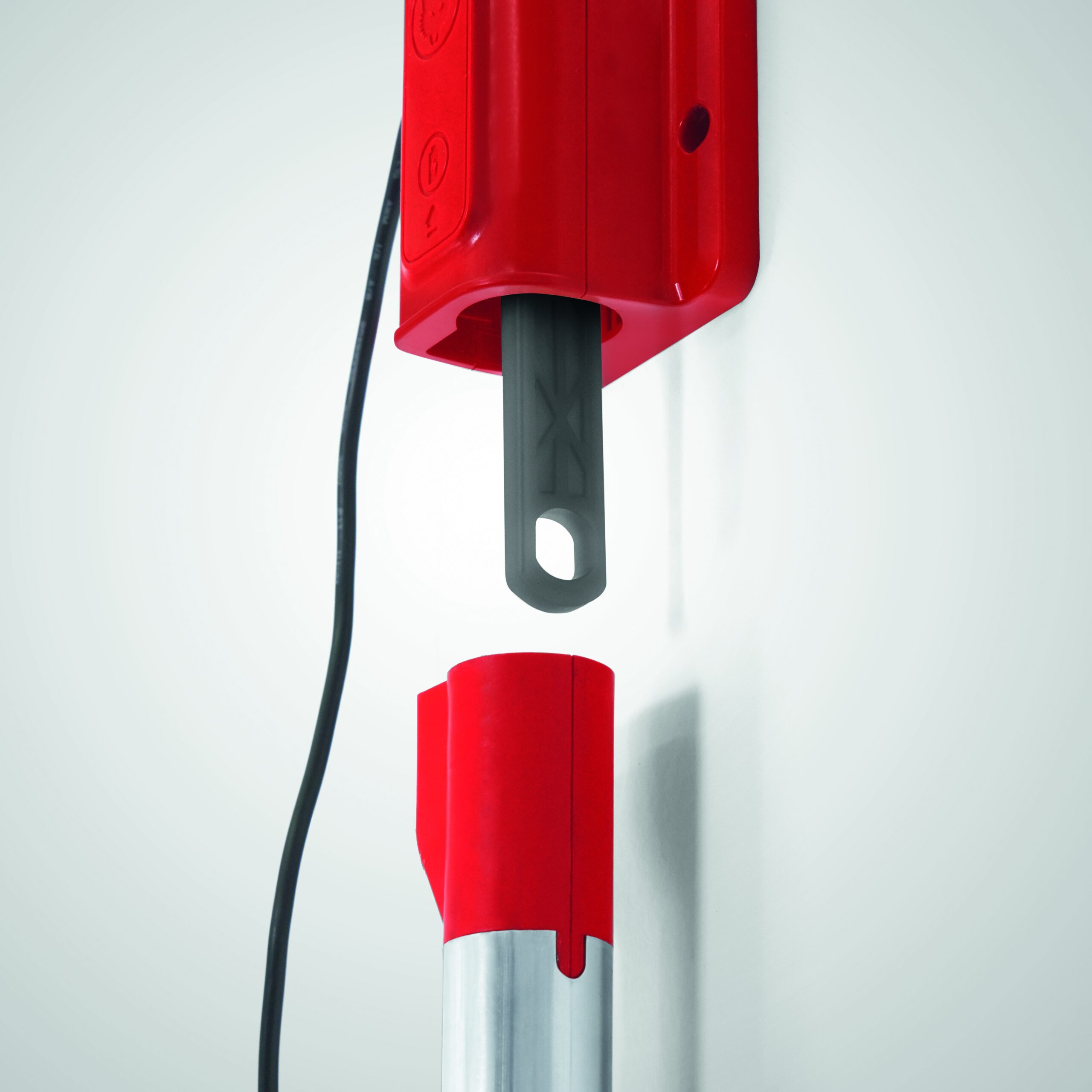 De basis van het duurzame e-multi-star-systeem is de aluminium BS 140 eM-steel, deze is 140 cm lang inclusief handvat en weegt slechts 1 kilo. Aangedreven door een accu-set met vijf 2,5 Ah lithium-ioncellen, heeft de 18V accu van deze basissteel een oplaadtijd van ongeveer 60 minuten. En je hangt de steel op in de muurbevestiging die tegelijkertijd ook de oplader is. Zo kun je altijd meteen aan de slag.