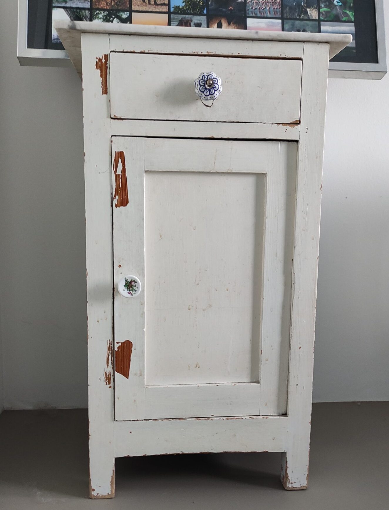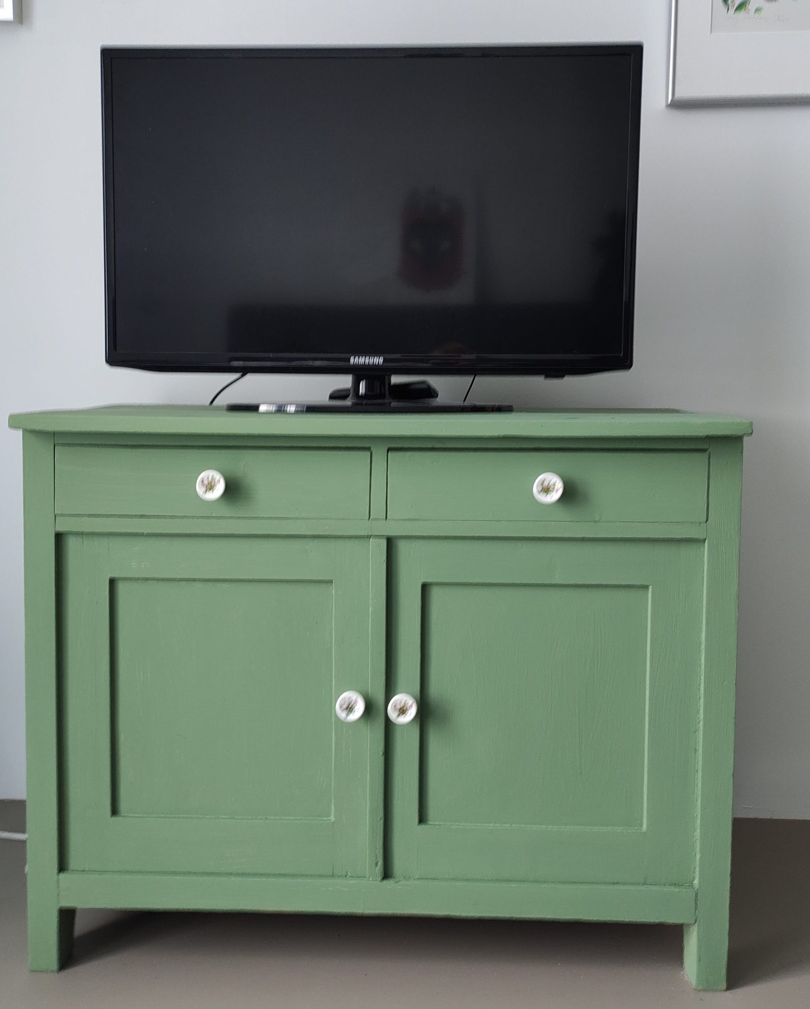 Zelf vind ik de ‘krijtachtige’ look, die de kastjes nu gekregen hebben, heel erg mooi. De kastjes krijgen de uitstraling van Shaker meubelen. Ik heb op het kleine kastje, porseleinen handknoppen gedaan. Op de commode heb ik de oude knopjes terug gedaan.