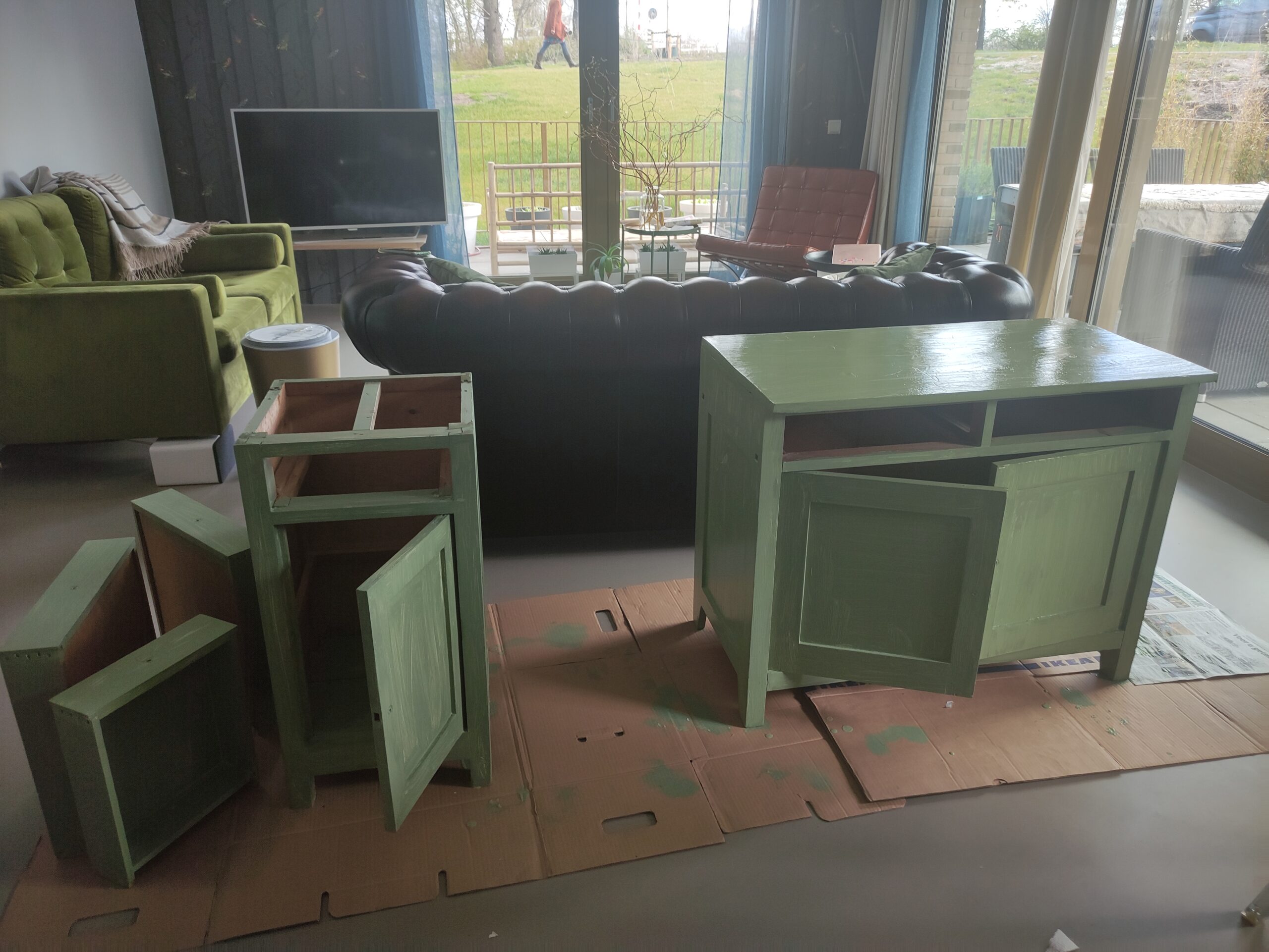 Afgelopen zondag ben ik begonnen, nadat Testman, de kastjes kaal had geschuurd. En ik zag de kastjes mooier worden, zelfs na de 1e laag Moose F. Maandagochtend doorgegaan met Moose F (1e laag) en dinsdagochtend de 2e laag.