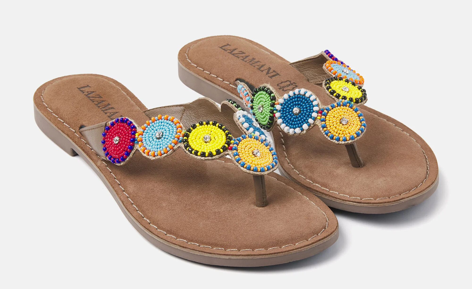 Het schoenenmerk Lazamani heeft een grote collectie slippers, klopjes en sandalen (en in de winter ook schoenen en laarzen. De zomercollectie bestaat ieder jaar weer uit verrassende modellen met nieuwe, frisse kleuren, prints, kralen, borduursels en combinaties van materialen.