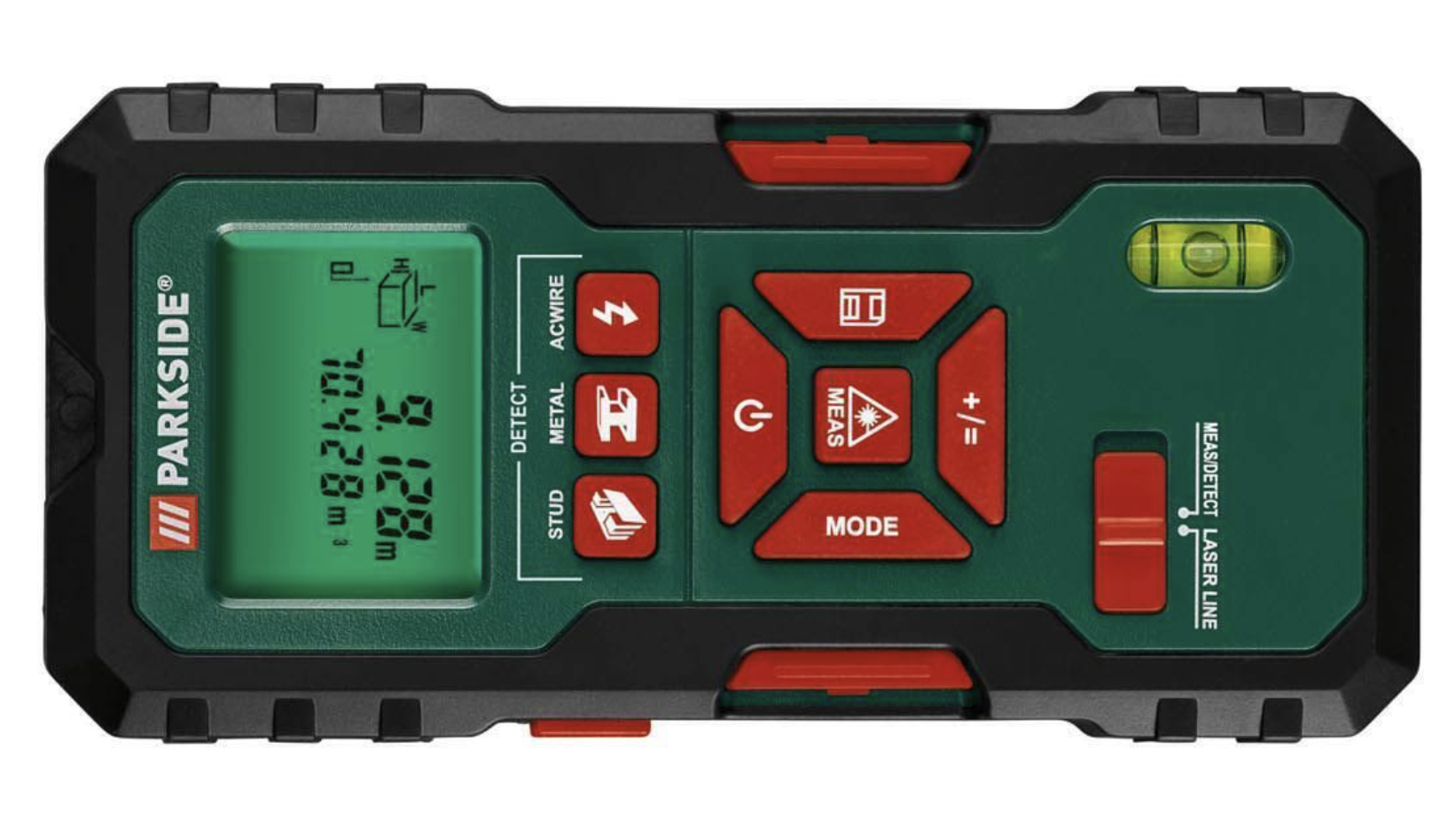 PARKSIDE 5-in-1 PMML 5 A2 detector met laserafstandsmeter; Dit is een onmisbare tool bij het plaatsen van keukens en badkamers, het ophangen van verlichting en schilderijen. Met deze PARKSIDE detector voorkom je dat je per ongeluk metaal, houten funderingen of een stroomkabel in de muur raakt. Daarnaast bevat het een laserafstands- en inhoudsmeter die tot op de millimeter nauwkeurig meet en markeert tot een afstand van 20 meter.